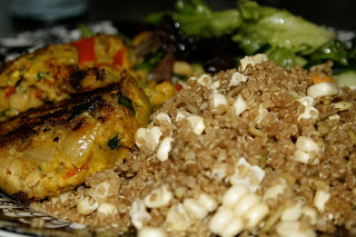 Ingredients: quinoa, beef stock, sunflower seeds, pumpkin seeds, fresh corn, salt & pepper; served with mixed green salad and lentil burgers.