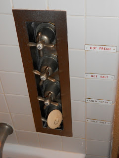 I finally got my keys – stateroom 157 on Deck A, which was about halfway down the very long corridor. It was just as you’d imagine it to be – beautiful Art Deco styling, gorgeously polished wood, richly colored crazy patterned carpet – and just a little bit spooky. As it has that faded glamor about it, it makes you feel nostalgic, curious, patriotic, sad and a bit weirded out all at once. An interesting mix. It was less spooky than the Hornet, but i was half expecting to see a kid on a trike turn the corner at any moment. Imagine the mind-tricks you could play on people with that. Note to self: never stay at old places with long corridors on April Fools Day…. Anyway, I finally found my room (and already changed from my heels to my flats) – it was smaller than I was expecting, but it was still absolutely charming and full of interesting period details. And – the best bit of all – it had portholes that actually opened!! Bloody brilliant. That, more than anything, took you in your mind to the Atlantic and to imagining what it must have been like to look through those windows and see nothing but the Atlantic Ocean, as far as the eye could see. It reminded me a bit of the feeling from when I went to Patagonia – a similar sense of all-surrounding desolation and vastness.