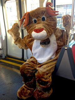After that, we did a quick whizz round Macy’s just to check out the Holiday floor and see if there were any random kids singing this year.  Fortunately the coast was clear, so i didn’t have to get my caroling on, but again, lots of people were very excited to see us, so we did our Rockstar Reindeer thang again for a bit, before agreeing we were knackered and it was time to hightail it home.  En route, we came across the fire truck that was collecting the toys and donations from all the Santas (fun AND for a good cause!), so we got a couple of bright red plastic fireman’s helmets as reward for our donation.  And very natty they looked too, carefully perched between our antlers (an artful lodger, if you will).   So, with that, we took our final MUNI trip, navigating the turnstiles and the moving escalator without incident (easier said than done wearing a huge reindeer head and big foam reindeer booties!) and finally made it home.