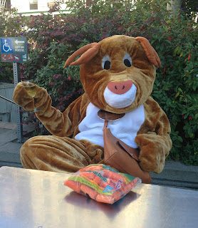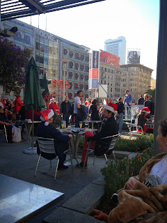 Other than that, most people seemed pretty well-behaved and not completely sh*tfaced.  As the weather was so much nicer than last year, I think the atmosphere was better and more relaxed and friendly, as people just hung out in Union Square, Santa-watching and making new friends.  As per last year, after about an hour of constant photo-ops, we managed to escape to the little cafe/wine bar down at one end of the Square to put our hooves up and enjoy an well-earned adult beverage.  Wearing a full length fleece suit with fleece head, feet and mitts in 65 degree weather is hot and thirsty work!   Alas, no Dante this year, but I did – bizarrely – get given a free bag of baby carrots by a bunch of Santas ahead of me in the queue.  How apropos.  So with free carrots and a glass of wine in hand, we sat and enjoyed the sunshine (heads off!)  – here are some of my pics from the 2013 SF Santa Con and the official write-up of the day’s festivities!