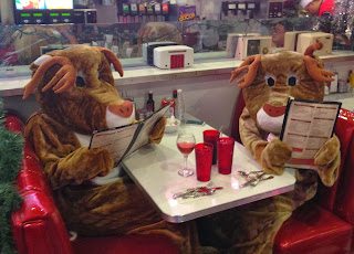 After an hour or so of chilling out, catching up and just enjoying the weather and good company, our reindeer bellies were starting to grumble a bit, so it was time to recreate one of the classic photo ops from last year, the Menu Shot at Lori’s Diner.  The reaction when we walked into the diner was classic   – the double-look, surprise and (almost universally) a smile.  So cool.   And – fortunately – this year, no  really cute kids wrapping themselves around me, so I was able to take my head off without fear of causing permanent mental scarring about disembodied reindeer.