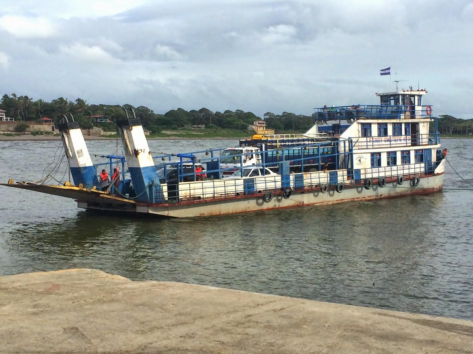 The ferry was fine but v….e…..r……y…….s…..l……o……w…… so although the crossing was quite short, distance wise, it took about an hour to chug our way across the lake to the port of Moyogalpa.  We sat up top for the first half of the trip, before – surprise, surprise – it started raining, forcing us inside to take cover.  The chairs in the middle deck’s lounge were surprisingly comfy (like those red velvet ones you get in movie theaters) and reclined nicely, enabling us to watch the shockingly atrocious local TV station in comfort.  If you have never seen local Nicaraguan TV, its absolutely priceless.  Its so awful, its brilliant.  And, it would also appear that Nicaraguans have mastered time travel as everything appeared to be stuck in the 80s! From the host’s Deirdre Barlow glasses (Loopy, I thought of you and our bridesmaid pics!) and unbelievable power hair, to the achingly  naive and endearingly unsophisticated ads on telly, even to the replay of 80’s classic music videos (when did you last see the video to the Ghostbusters theme tune?), I felt as if I’d inadvertently stepped into one of the Back to the Future movies, and Marty McFly would race by at any second.