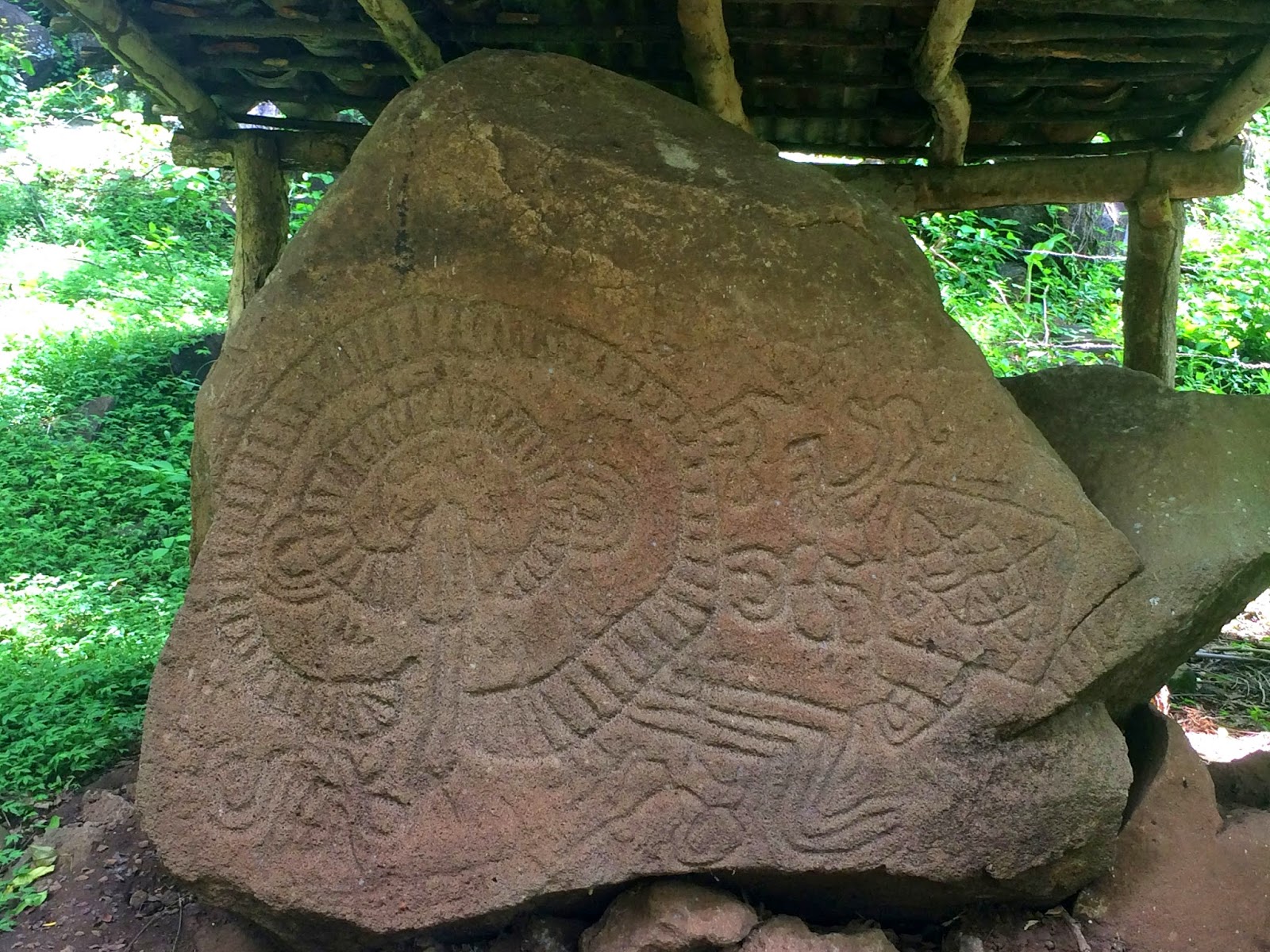 Next up, some ancient carvings and stone art.  Now.. I’m not sure i can actually remember who did what, when – but I do vaguely recall the estimated date for these carvings is about 1000-1200 years old.  Pretty damned impressive, really.  We saw 7-8 of them, just hanging out in the fields, protected from the elements by little wooden shelters.  The guide told us that they were all in the places that they were originally discovered in but not the place they were originally carved.   Yes, these – and many countless thousands and thousands of tons of rock were displaced during the last major volcanic eruption, so no-one actually knows where on the island exactly these petroglyphs came from.  As for what they depict?  Well, your guess is as good as any too!  (If you want to learn more about the petroglyphs, here you go: http://www.ometepenicaragua.com/petroglyphs/index.php)