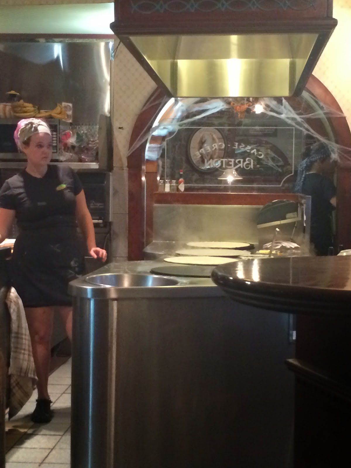 My table afforded me a great view of the cooking area, where the pancake magic happened – 4 big cast iron round hot plates that lovingly accepted the crepe batter and turned it into the chewy, yet softly yielding and crispy-edged deliciousness that was presented to me after a short wait. It was stuffed full to the brim with strawberries (apparently taking on the appearance of a toad!) and served with a little dollop of whipped cream. With the chaser of chocolat chaud, its gonna take me longer than 10 days to detox off this lot!! But to hell with it – I’m on holiday, right?