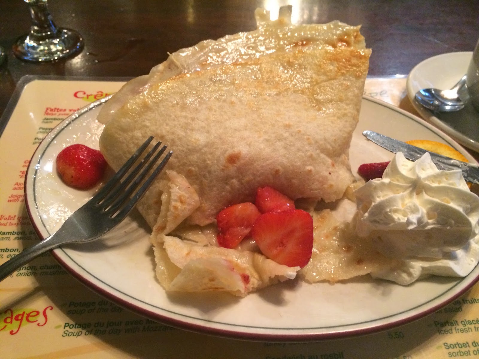 It was a pretty tiny place with arse-challenging small gaps between the tables so you had to squeeze your way into your seat (alas, sucking your tummy in does nothing to reduce the size of your behind, so the guy on the table next to mine was lucky my cheeks didn’t take out his café-au-lait). Perhaps it was a way to make sure people didn’t completely overindulge in crepey-deliciousness – there’d be no way you were getting back out if you did! Anyway, perusing the menu, it was as you’d expect – lots of choices and options that ultimately boiled down into a single choice – did you want a sweet crepe or a savory one? I opted sweet (it felt a bit too earlier for savoryness) and plumped for a sugar and butter crepe filled with fresh strawberries. Oh, and washed down with a small (cos I’m on a diet) mug of hot chocolate. For less than $5 for the crepe, it had to be the best deal in town!