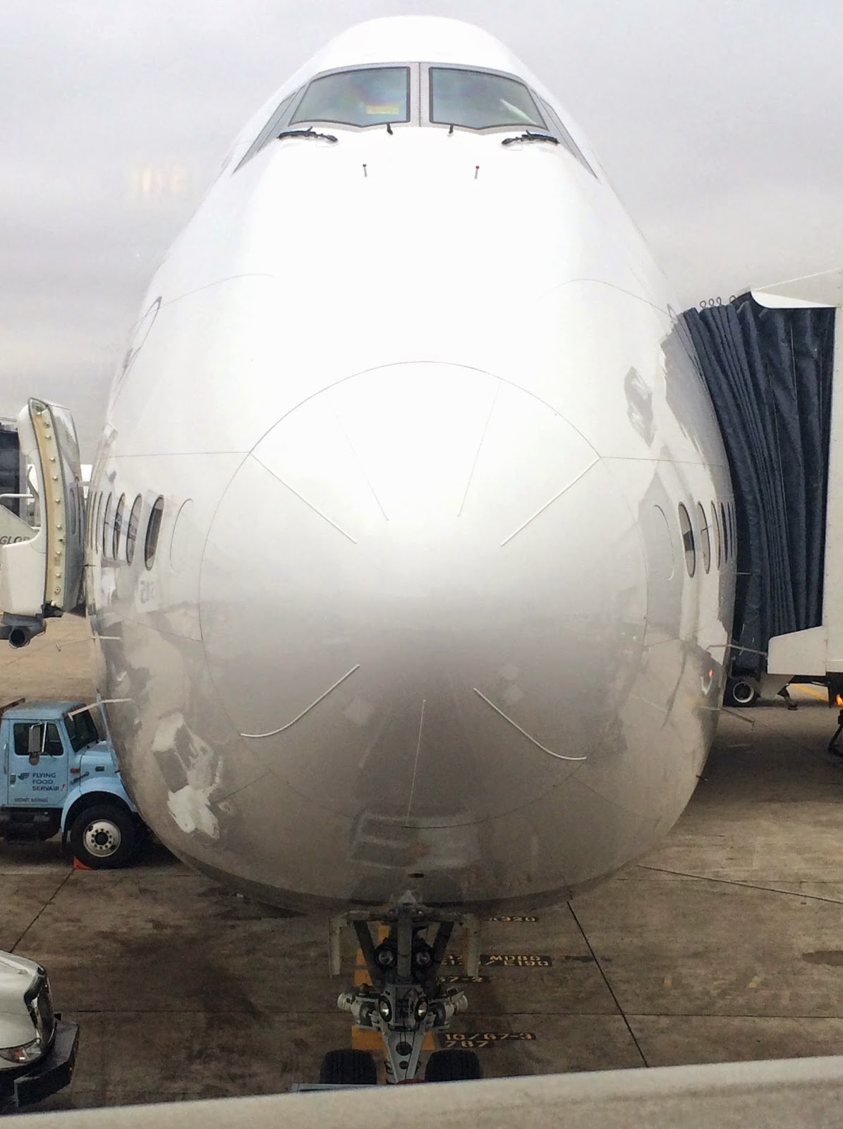 Today’s service in the skies was to be provided by Austrian Airlines – a code share with United. I’ve not flown Austrian before, so i was curious to see if the in-flight announcements would be regular or yodel-style. Because today’s flight was an international one for work, I got to travel business class (yey!) and was treated to this rather imposing view out of the lounge window, directly in front of where I was sitting. Quite fun when the planes were pulling in – you hope that the pilot’s foot doesn’t slip off the brakes at the last minute…
