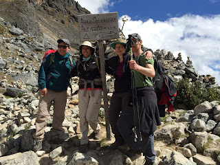 The first bit of the hike led us out of the lodge the same way as yesterday’s hike to the glacier but then, after 20mins or so, we hiked off to the right, starting to ascend the Rio Valley. The scenery was again absolutely spectacular, surrounded as we were by glacial mountain ranges (apparently Southern Peru has the highest number of glacial peaks in the Andes – but I’m sure Captain Obvious already knew that) and the first hour or so wasn’t so bad. Then, though, we started to ascend at a steeper incline and it became harder and everyone became much more focused on finding their own rhythm and balance between hiking and breathing. The hardest part of the trail, about 2 and a half hours in was the section that is called the Seven Snakes which is, as you could probably guess from the name, a long section of crushingly hard switchbacks. After those were conquered (we did it! we’re still alive! OMG!), it was only another half hour to our Snack Break (bloody love those) were we could take a breather, a drink and a pee!