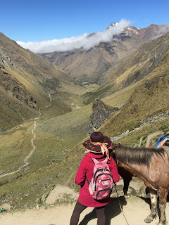 | Our super-stylish horse girl, Anna. If you look waaaaay in the distance, you can just see the lodge we just hiked up from en route to Salkantay pass. |