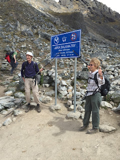 We spent about a half hour at the pass, taking picture and enjoying the simply majestic views until it was then time to start our descent. Obviously going down is easier in some respects than climbing but, for reasons we’ve discussed previously, its just as difficult in different ways. The terrain underfoot was very uneven and rocky so you had to concentrate intently on where you placed every single footstep, so that you didn’t mis-step and twist an ankle (or worse). As with the ascent up, here our little tribe of 10 trekkers had self-organized in a quite interesting way over the last 3 days with a, by now, not explicitly stated but well-understood order and structure to it. Obviously Heidi was always up front, strolling along without poles and with her hands in her pockets. Then usually came Captain Obvious and Mountain Goat (although as mentioned before, he was a bit of a wild card in the Order Of Things), followed by HHM and Crazy Sticks. PYFU, was usually behind Captain Obvious but, for some reason on the ascent up to Salkantay Pass, she was just in front of me. Then there was me, heading up the Brit Pack at the back (Lisa is an honorary Brit for this part of the story), followed by Top Brit, then Top Banana then Lisa, bringing up the rear. Top Banana was Lisa’s pacer and I was the canary in the cage for the Brit Pack, trying to find the best path downwards for everyone who was following me. Now, I know what you’re thinking “but you’re so clumsy – how on earth did that work?” but here’s the funny thing – when I was concentrating intently on trying to find a path for the others, my own Clumsiness Index dropped dramatically. Weird, huh?