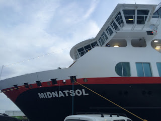 We got a cab over to the terminal, even though it was a fairly short walk, as the pavements were a bit slushy so we didn’t really fancy lugging our bags through it. The first sight of our Hurtigruten ship, the MS Midnatsol, was impressive – you get the sense that is a ship that doesn’t fuck about. Built to withstand the Norwegian winter and, hopefully, any potential icebergs that might come our way. Our ship’s name translates into Midnight Sun – a bit ironic given we are at entirely the opposite end of the solar calendar right now, having just had the winter solstice! If you are interested in learning more about either the ship we are on or the Hurtigruten ferry, here’s the weblink: