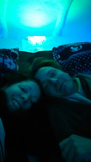 After about an hour, the bar closed up and we retired upstairs to the comfy warm lounge for a bit, to defrost and mentally prepare ourselves for our impending icy slumbers! After everyone else had gone to bed, we figured we couldn’t put it off any longer and headed downstairs to our snowquarters. We’d already laid our sleeping bags out ready on the bed, so all we had to do was get VERY quickly undressed to our thermal underlayers and hop inside, remembering to put our outer layer of clothes inside the bag, so they’d be warm to put back on the next morning. Our boots? Well, they had to be left by the side of the bed, so would be a bit chilly in the morning, but we’d survive. And then, with a kiss goodnight and wishing each other luck, we bedded down for the night. There was no light to turn off – just the soft illumination shining right up Marilyn’s skirt behind the bed. Fortunately, snuggling down into the sleeping bag blocked that out, so it wasn’t a problem.
