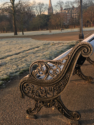 Frost glittering on an ornate iron bench in Kensington