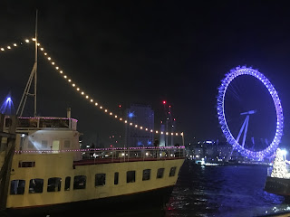 Anyway, by 10.30pm our dinner torture was finally over by which time we only had another hour to go before we could go up on deck to get ready for the fireworks. You can see from the pictures just how close we were to the London Eye, the site of the firework display. There was a great atmosphere on the boat, with everyone just relaxed and having a good time. It was cold on deck, but we’d bundled up so we were warm enough. At around ten minutes to midnight, the servers came round handing out glasses of champagne with which to toast in the New Year and finally, we were in the countdown!!
