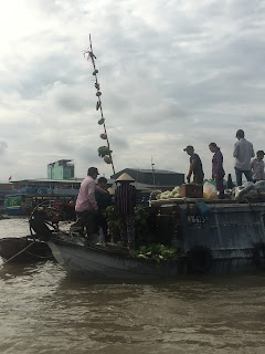 | Cai Rang floating market. The stuff on the pole tells people what that boat is selling. |