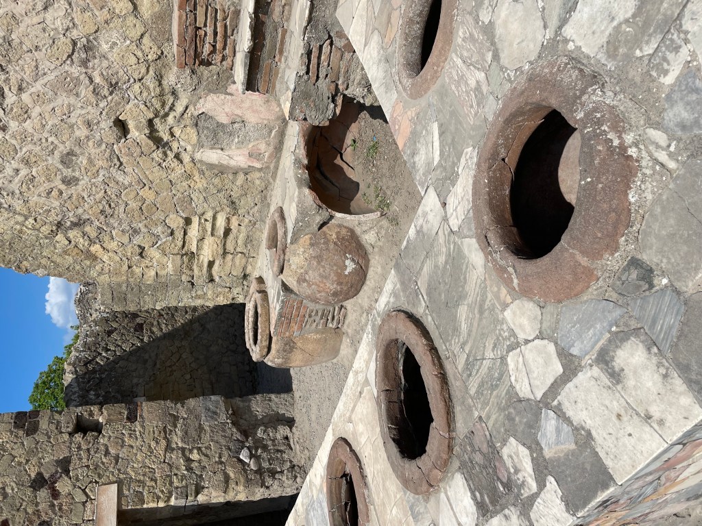 Anyway, we landed in Rome without further incident and after a shockingly efficient transit through immigration and baggage claim (Italy can’t seem to keep a government going for longer than 12 months, but they’ve absolutely nailed the airport bureaucracy!), we met our driver Nico who was going to take us to Positano, courtesy of side trips to Herculaneum and a winery near Pompei for lunch. As I hadn’t really slept on the plane, sitting in a car for 3hrs felt like the least-effort transit plan – and it was actually very smooth and comfortable. After about 2hrs we arrived in Herculaneum to meet up with our private tour guide – an enthusiastic and suitably bookish young woman. She showed us the main sights of the site – basically think of a smaller, less crowded Pompei. Unlike Pompei which got covered with hot ash, Herculano got covered with lava so she was telling us the history of how and when the site was excavated and the amount of lava rock they had to cart away. Pretty incredible. And even cooler – most of the city is still buried and inaccessible because the modern city of Herculaneum was build right on top! I think my favorite parts of the city were the fast food shops where you could still see all the big round terracotta pots in place where the shop keeper would store the food for serving! The murals and frescoes were incredibly well preserved too – especially those in the spa baths. Its incredible this was somehow hacked out of being covered in lava without being damaged or destroyed – how did they do that??? I can barely peel an egg without gouging out great big lumps! Also, penises. Penises were everywhere. Apparently back in the good ole days of the Romans, penises were just your average run-of-the-mill good luck charm and fertility symbol and they were scattered everywhere! Above the door frames, carved into walls, little phallic statues standing to attention ready to wish you good fortune. It was really quite charming.