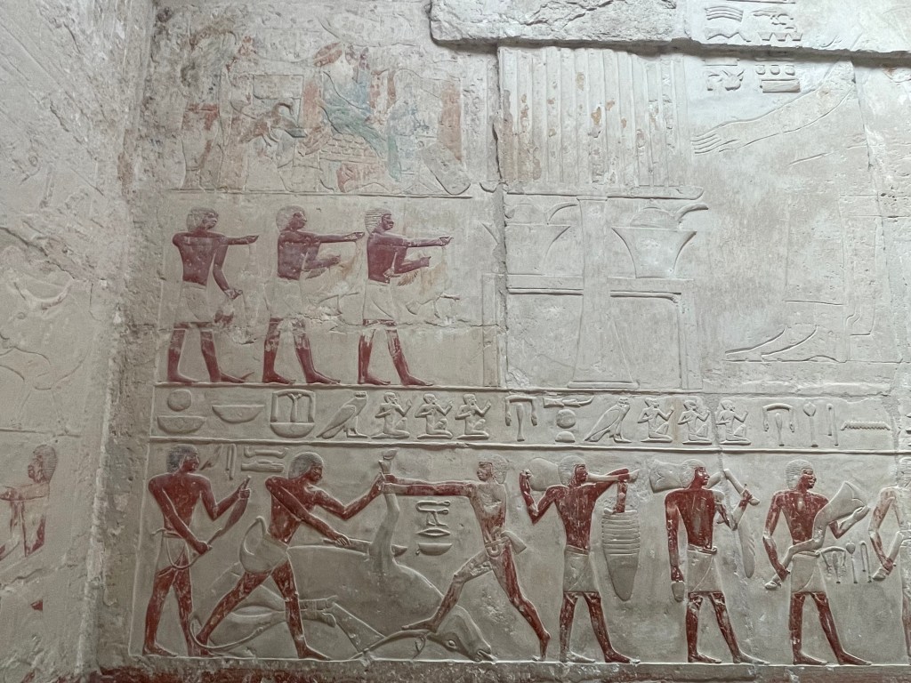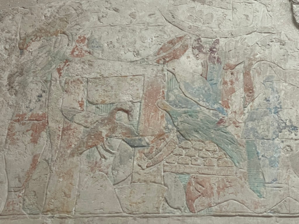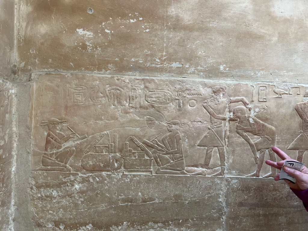 We also visited the tomb of Princess Seshseshhet Idut, who was a princess in the 6th dynasty during the reign of King Teti (c.2345 – 2323 BC). The wall carvings inside were just incredible – the color of the various ochres used so vibrant after nearly 5,000 years!! Gina pointed out various interesting carvings depicting daily life during that time – including one of people collecting taxes (with a delinquent getting beaten as punishment!) as well as many different animals, fish and flora (my favorite – the baby hippo being born – right into the jaws of a waiting beast!). Under some hieroglyphs, there were additional markings – which Gina explained were numbers so it was basically a shopping list for the various servants, animals and foodstuffs the Princess required to be provided to her for the afterlife!