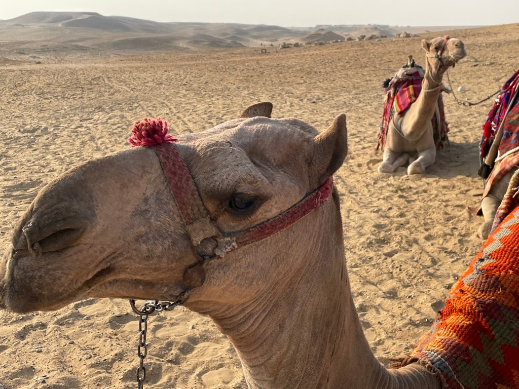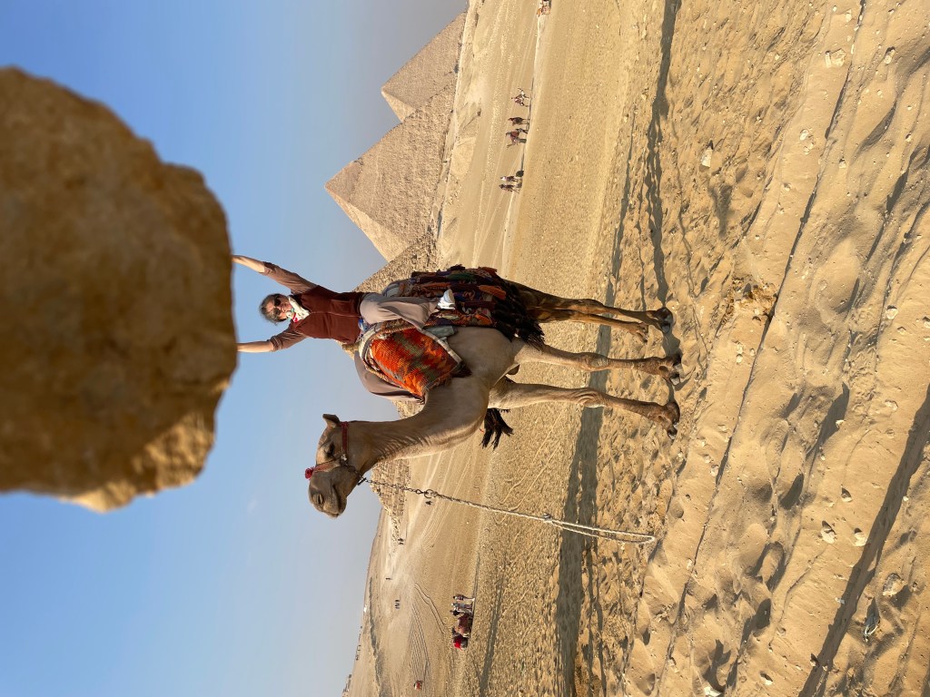But wait! There was even more excitement for our first day in Egypt (we haven’t even been here for 24hrs yet!) as we decided to take a very local form of transport to our restaurant for lunch – a camel! I’ve been on a camel before (a long time ago with Mumsie in Tunisia) so I remembered the drill for how to get on and off but it was a first for Lisa. My camel was called Mickey Mouse (umm…), Lisa’s was Ali Baba and Lee Ann’s was Michael Jackson (no moonwalking, alas!) It took about 25mins to ride over to our lunch stop, during which we got some great pictures, taken by our guide Mahmoud.