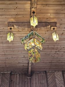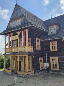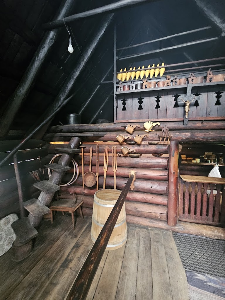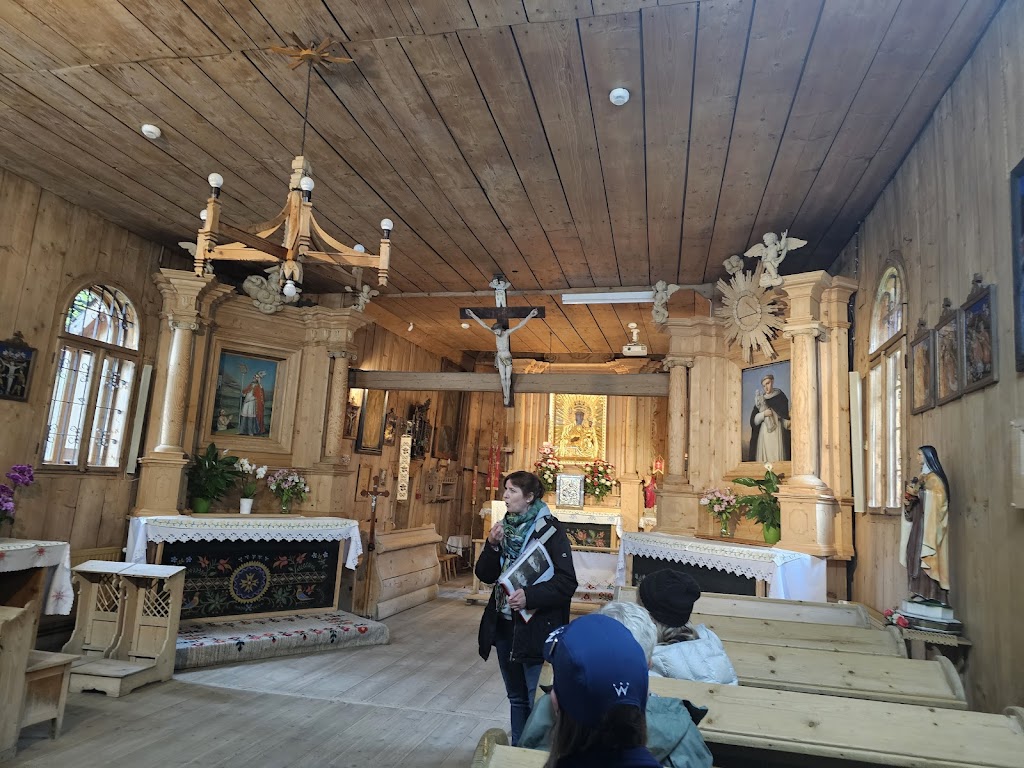 After lunch, we started driving through what is known as Lesser Poland and the Timber Architecture Route, stuffed full of wooden houses built in the Zakopane style, established by an architect called Stanislaw Witkiewicz. We had the opportunity to go into one, occupied by a local wood carver, to see inside these two roomed houses. One room was the Black Room where the fire was & where everyone lived; the other room was called the White Room – where linens and fancier clothes were kept and used for special occasions only. The Black Room was full of authentic artefacts from the period – lots of wooden implements for cooking, farming and the like – and this is where the whole family (and occasional baby animal) would live. The former White Room was now the wood carver’s studio, so we had the opportunity to watch him work as well as buy any of his hand made pieces (basically lots of statues of Jesus – definitely needed to make a few more bowls and spoons for us heathens).