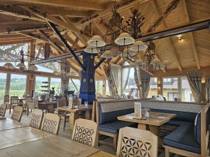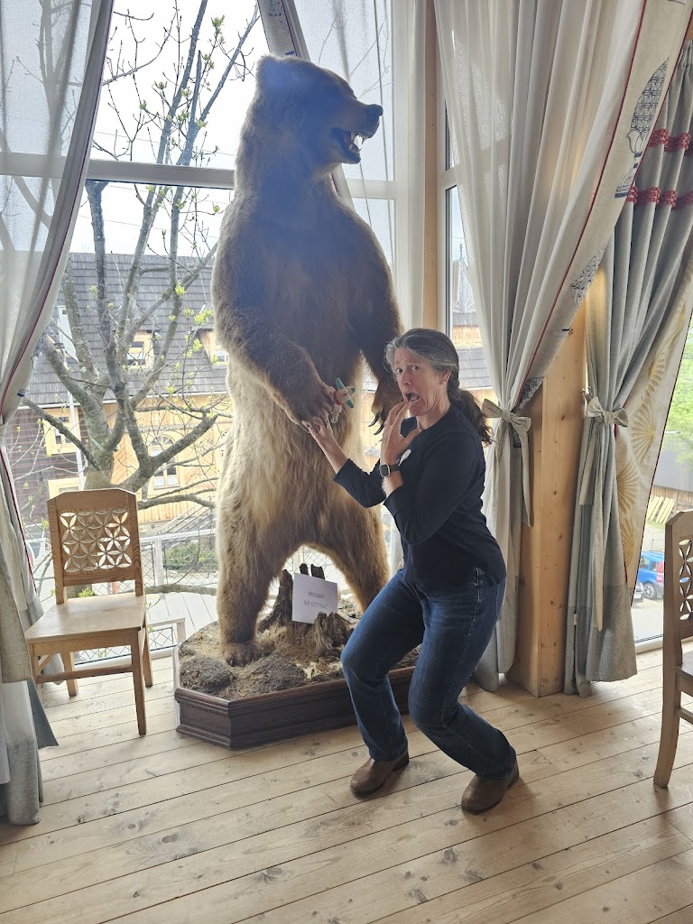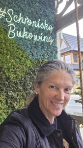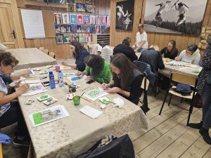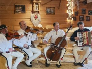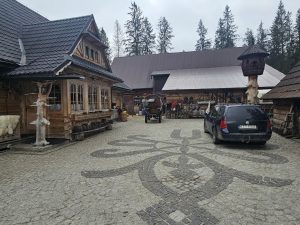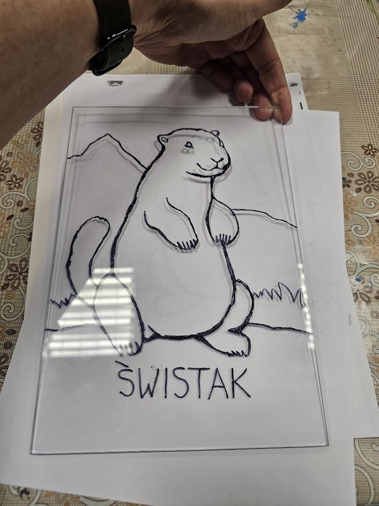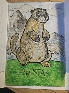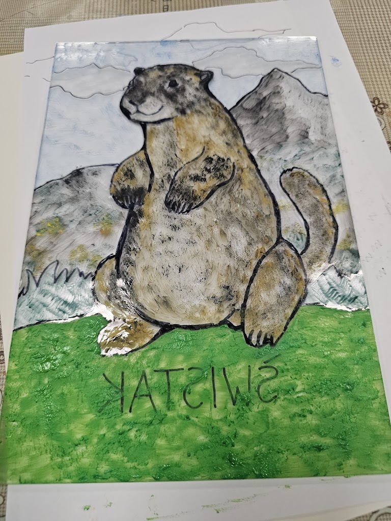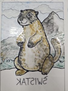 The next day, the weather had improved considerably and our itinerary had us driving to the town of Bukowina Tartrzanska and to the Culture Center and School of Dying Trades (catchy name!). We met a young lady who gave us some of the history of the center – it recently celebrated its 100year anniversary (which in these parts makes it a youngster!). The main reason we were there was to try our hand at glass painting – examples of which dotted the cultural center and which we’d also seen during our visit to the Red Manor House the day before. We were led upstairs to this classroom, where there were a dozen stations set up, each with a little pane of glass and a black permanent marker. There wasn’t a whole lot of instruction given, other than you needed to paint the front details first, then work backwards, as you would be painting on the rear side of the glass, then flipping it over to view the finished product. Fortunately, they had a set of templates depicting various scenes and objects that we could choose from – lots of the ladies chose to do flowers and floral scenes – I decided to do a big fat happy marmot. You trace the outline with the marker on the back of the glass, then simply fill it in using acrylic paint – then you’re done! I think we were painting for about an hour – and I’m actually pretty happy with how mine turned out! I guess doing all those terrible Bob Ross paintings during the pandemic (that Mum gets to “enjoy” in her basement at home) might have rubbed off on me!!