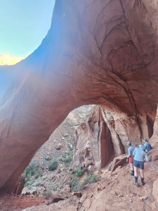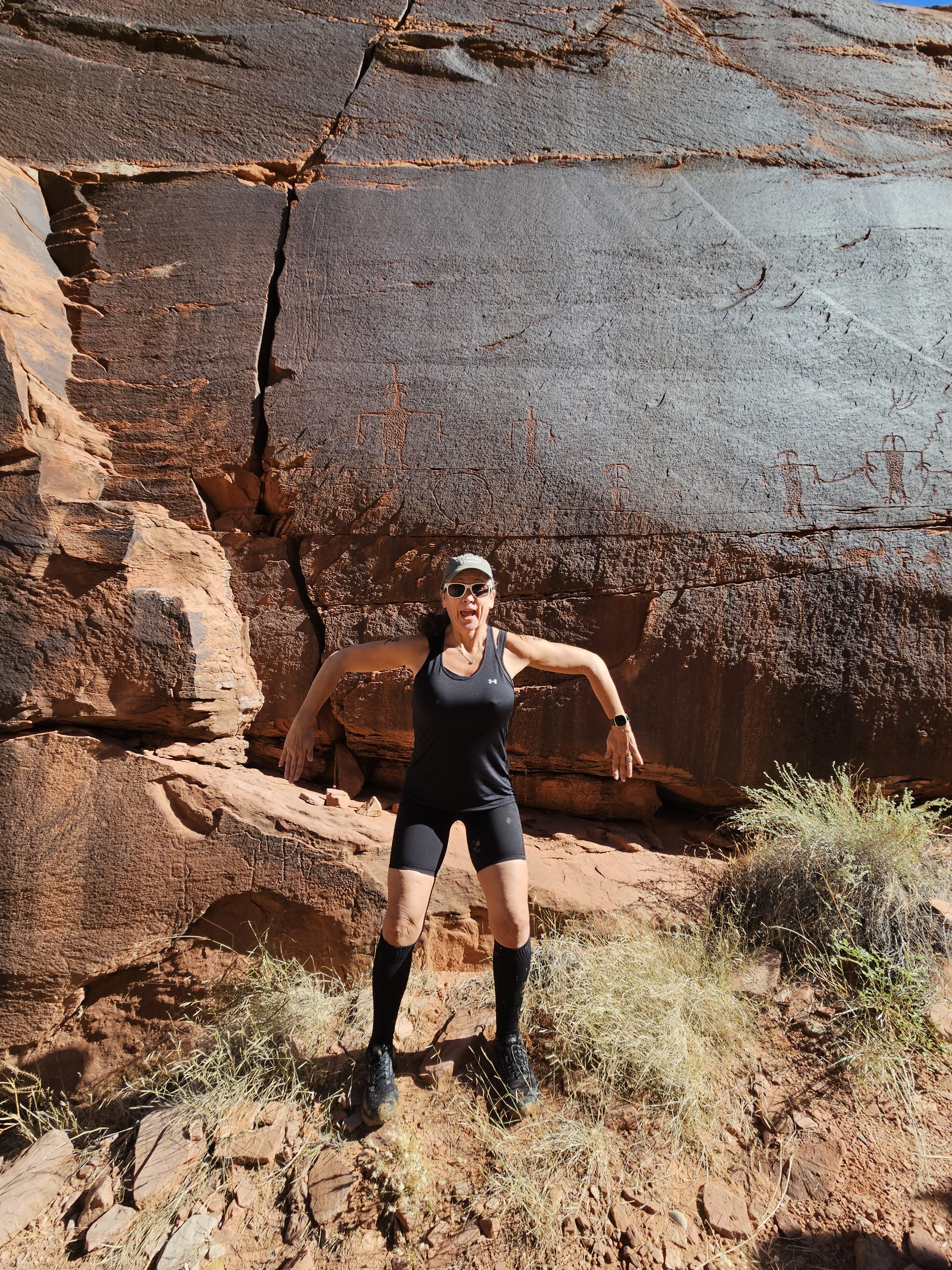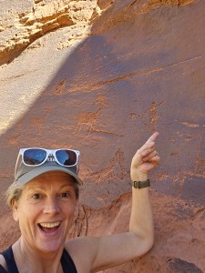 Today’s route would take us past a couple of highlights – some more petroglyphs and an impressive rock formation called Wrather Arch. Wrather Arch is the most inaccessible natural arch in all of Arizona (and I think there are a LOT of arches here) as there is no way to get to it other than hike through Paria Canyon and then take a side quest (as our guides adorably called them) to hike up the cliff face to get to it. Today there were a lot more slips and falls across the board – but nothing too serious. We spent a LOT of time wading through the river – and apparently will continue to do so as the canyon narrows and the amount of river bank decreases. By this point, though, we were all pros at water crossings and I was very happy that my shoes and neoprene socks were holding up very well – no blisters in sight! (actually, not quite true – I did come into the hike with a pre-existing blister on the third toe of my right foot – but this was caused by jumping around in 4-inch high fringe and sequin boots during our Woodland Creatures show the day before I left, so it was earned in a good cause). On our way to Wrather Arch, we stopped at the Big Horn Sheep panel petroglyph to admire some more ancient rock carvings, etched into the desert varnish – including a picture of a person who seems to be cheerfully indicating the way out of the canyon – GPS, pre-historic style. While some of the petroglyphs are pretty self-evident (especially the sheep!) some of the other symbols are rather more mysterious and no-one really knows what they mean. You can see, fairly frequently, pictures of people where they have their hands up, in a T, or pointing downwards in an upside-down U shape. Apparently, the thinking is that hands UP means ENEMY, whereas the hands down stance means FRIEND.