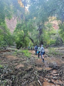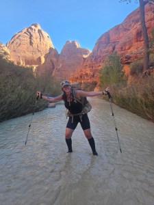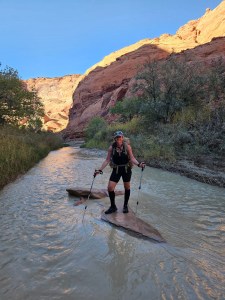 Another fun side quest was to visit Shower Spring during our lunch break which – as the name suggests – is a natural fresh water spring hidden behind a thicket of tall bushes (can’t remember what the plants were – lets say some type of bamboo, shall we?). While the guides were busy filling up their water buckets (Pika and Ronnie were ON IT every single day, calculating exactly how much water we all needed to carry – both to keep us personally hydrated on the trail, as well as additional water that may be needed for the camp), the rest of us were larking about in the pool, enjoying rinsing at least some of the Paria River stank off us! It was pretty easy to tell if we were properly hydrated or not – if we needed to pee regularly, we were drinking enough! Btw, peeing on trail is a lot easier than pooping – you basically squat down in the river and do your thing – as our guides said to us “dilution is the solution to pollution”. Everyone would either look upriver, to give you privacy, or you would hike back round a bend out of sight. And FINALLY – that evening, I managed to have a poop!!! (I knew you were all wondering). It wasn’t going to win any prizes for Most Impressive Outdoor Dump, but it was something and I felt sooooo much better afterwards. And – no exaggeration – as soon as I stood up after finishing my business, my FitBit watch buzzed on my wrist and informed me “WEEKLY GOAL ACHIEVED”!! Why, thank you, FitBit– I appreciate your encouragement – though am slightly concerned you are tracking my poops now.
