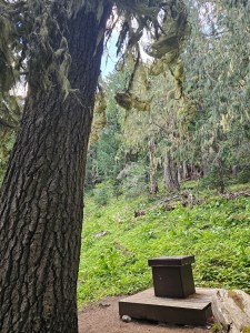Anyway….. clearly the Park Rangers of Mt Rainier NP took all these various factors into consideration when planning for the pooping needs of backpackers so, instead of these vault toilets-in-a-box – instead what you have is simply a box. On a platform. Out in the open. You lift the lid of the box and there’s a toilet seat, affixed to the box, over the big hole that you do your business into. That’s it. For this campsite, there were no walls at all – so your privacy comes from the fact that it is set a few minutes walk away. For some of the other campsites, there were sometimes one or even two walls (it’s amazing how quickly your concept of “luxury” can adjust while backpacking!) to provide some privacy, but it was an interesting new experience for me, sitting on the pot, literally in the middle of the woods surrounded by nothing but trees and possibly bears! As I was sitting there, I could also hear this deep thrumming noise coming from all around (no, it wasn’t me) and my mind initially wondered if some crackpot had a drone out here. It’s like, what the fuck is that? As I walked back toward the campsite, I passed this meadow full of beautiful yellow dandelion flowers, and I realized the sound that I could hear was actually bees and wasps and insects. While it is clearly good for the planet that there are still enough pollinators around in such vast quantities to make such a racket, I will confess to quickening my pace to get the hell out of there ASAP.