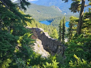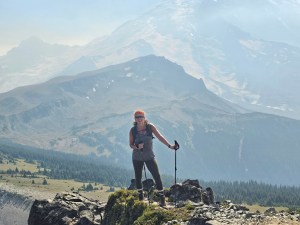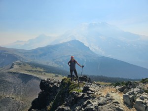 Another memorable day (they were all enjoyable, but there were a couple of standouts) was the second to last one where we ascended Skyscraper Peak (elevation 7078′), the one we had seen right on the first day from the top of Fremont Lookout Tower. Now that was a hard climb, particularly as you got to the very top, as it turned into a bit of a scramble and the path was super narrow with very sharp drop offs (Mum – feel free to skip this part). Me and a couple ladies who I ended up hiking with for most of the week were the first to get there and enjoy the feeling of achievement. Unfortunately, while the views were spectacular, the puzzling preponderance of animal poop and accompanying biting flies at the summit made it an unpleasant experience, so we quickly took our bragging rights pics and then headed straight back down to the base of the peak, to the alpine meadow, to wait for the rest of the group to catch up and do the same. The next day, it was time to bid a fond farewell to the glorious, imposing (and thankfully still dormant) icy volcanic peak of Mt Rainier and make our way back into civilization, coming around the back of Skyscraper peak and passing by where we took the detour on Day 1 for our hike up Fremont Tower.