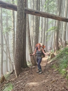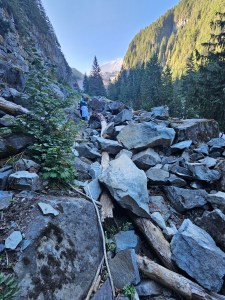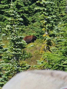So that was good to check off our Mt Rainier Wildlife Bingo List – then a couple days later, we saw actual real live bears!!! We know there are black bears in these here woods – this is why at night, you have to tie up everything up out of their way. So all food, any toiletries, toothpaste (basically anything with a fragrance or odor) gets put into bear proof bags and then hung up a big pole so that the bears can’t get to it. Over time, the bears have learned this is what happens so there are now far less encounters with bears in campsites, looking for food – but given we are in bear country, we need to take these precautions. Even though we were in bear country, there was no guarantee we would see any – but on the third day on the Northern Loop Trail, we saw bears! Real ones! Live Ones!! Myself and 2 other ladies were hiking at the front, walking through this beautiful high alpine meadow, covered in huckleberry and blueberry bushes, and dotted with trees. As we rounded a corner on the trail, we saw movement off to our left – and there it was – a black bear, about 50 meters ahead of us, at the base of a large fir tree. We stopped dead in our tracks. He stopped in his – and then he quickly shuffled up and round the tree, heading in deeper forest and away from us. I managed to get a couple of pictures before it disappeared – showing them to the guides later, they figured it was probably a juvenile bear that had just been kicked out by its mama bear to fend for itself. It was a real thrill to see one in its natural habitat.