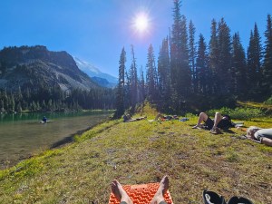 The other thing about backpacking, that I learned from Isle Royale, is that you very quickly figure out what is totally extraneous versus the things that you absolutely need. After the Isle Royale trip, I’d upgraded my sleeping system (an inflatable mattress and foam pad that goes underneath it) as well as added one indulgence – an ultra light camp chair which is absolutely brilliant and weighs just under a pound. It’s a kind of a flex, really, to whip out your camping chair at the top of the mountain, so you are sitting comfortably while everyone else is perching their aching bum cheeks on rocks or knobbly logs (you do kinda feel like a backpacking king). After the last trip, I also bought a small sheet of Tyvek (that white, crinkly covering you see on the sides of houses) which is super, super lightweight and gives you a nice clean area to put all your stuff on as you’re packing up your tent, so you don’t have to just put your belongings down on the dirt. Instead you can just pile it all on top of this Tyvek sheet as you are breaking down or setting up and job’s a good un. Pro Backpacking move, right there. (I did think of some additional improvements to make to my kit, as a result of this Mt Rainier trip – namely, a teeny tiny sponge to help with cleaning my plate after meals).