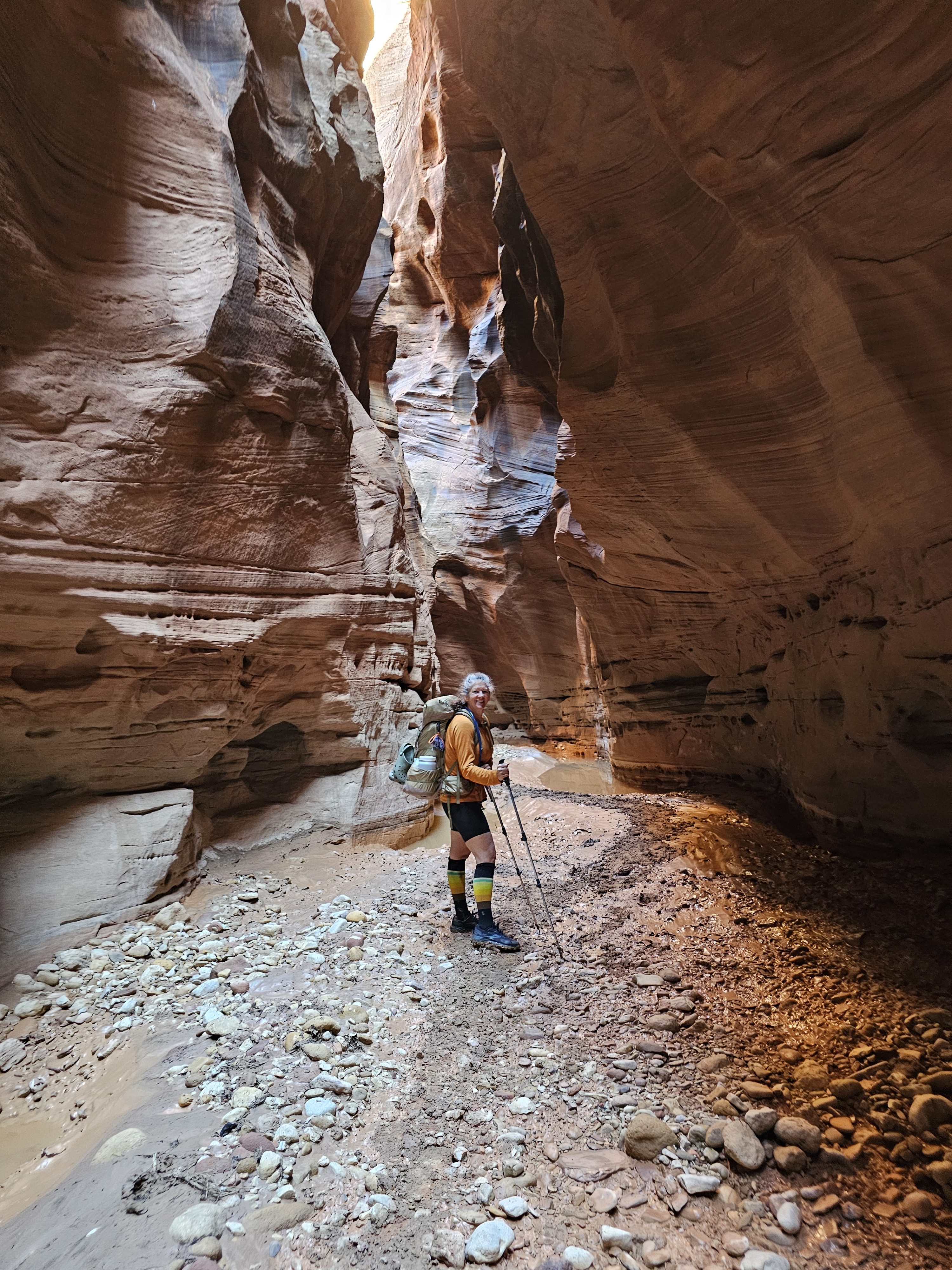 Because of this snafu, we were a bit behind our regular schedule, but we just all dug in, Kept Calm and Carried On. There was still at least another 5 miles to go before we would reach our exit point and this Gulch was not to be rushed. As you can see from the pictures, the scenery was – as expected – stunning, with the high canyon walls providing as much of a dramatic backdrop as any we had seen in Paria Canyon. Because it was narrower, though, it was harder to navigate and so it felt much slower going. Maybe it was the lack of sun and the overall cold, but I’m not going to lie – it was challenging. It was less about the physical challenge (although my legs did start to feel a bit tired by the end of the day), but it was more about the mental exertion that became necessary to keep going. Maybe we were all a bit frazzled by the Boulder Jam Incident, but after another couple of hours of slogging, I was kinda Over It. The miles seemed fucking endless. I was cold and tired and hungry and was just wanting to be there already. After an hour of this mental internal tantrum, I realized that just had to make peace with where I was, right now. Being able to deal with this type of struggle is just as important for my endurance training as is the physical conditioning work. So I surrendered to the reality of my current situation and remembered to “Embrace The Suck” rather than fight against it (an important piece of advice bestowed on me during my Isle Royale trip). It didn’t change how cold my feet felt – but it did help make the last couple of miles less of a battle.