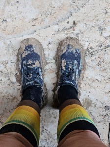 Our guides had warned us that today might start off a bit chilly, hiking through the gulch, as there was very little sun to be had right down at the bottom of the canyon. They were not wrong. I wore my little black puffy jacket for most of the hike and was still pretty chilly – and alas, there was not much that could be done to warm up our feet. They stayed cold and wet for the entire day. The mud was EXTREME – it was very very slick and caked our trail shoes, such that each step became harder and harder as your feet became more and more weighed down and the sole’s tread completely disappeared, adding to the overall spiciness of your hike. If we weren’t slogging over the mud, we were wading through the water – and this, again, was cold AF. We did meet a few people en route, some of whom told us of chest high water further up in Buckskin Gulch – fortunately, that was past our exit point, so fingers crossed it wasn’t going to get that bad.
