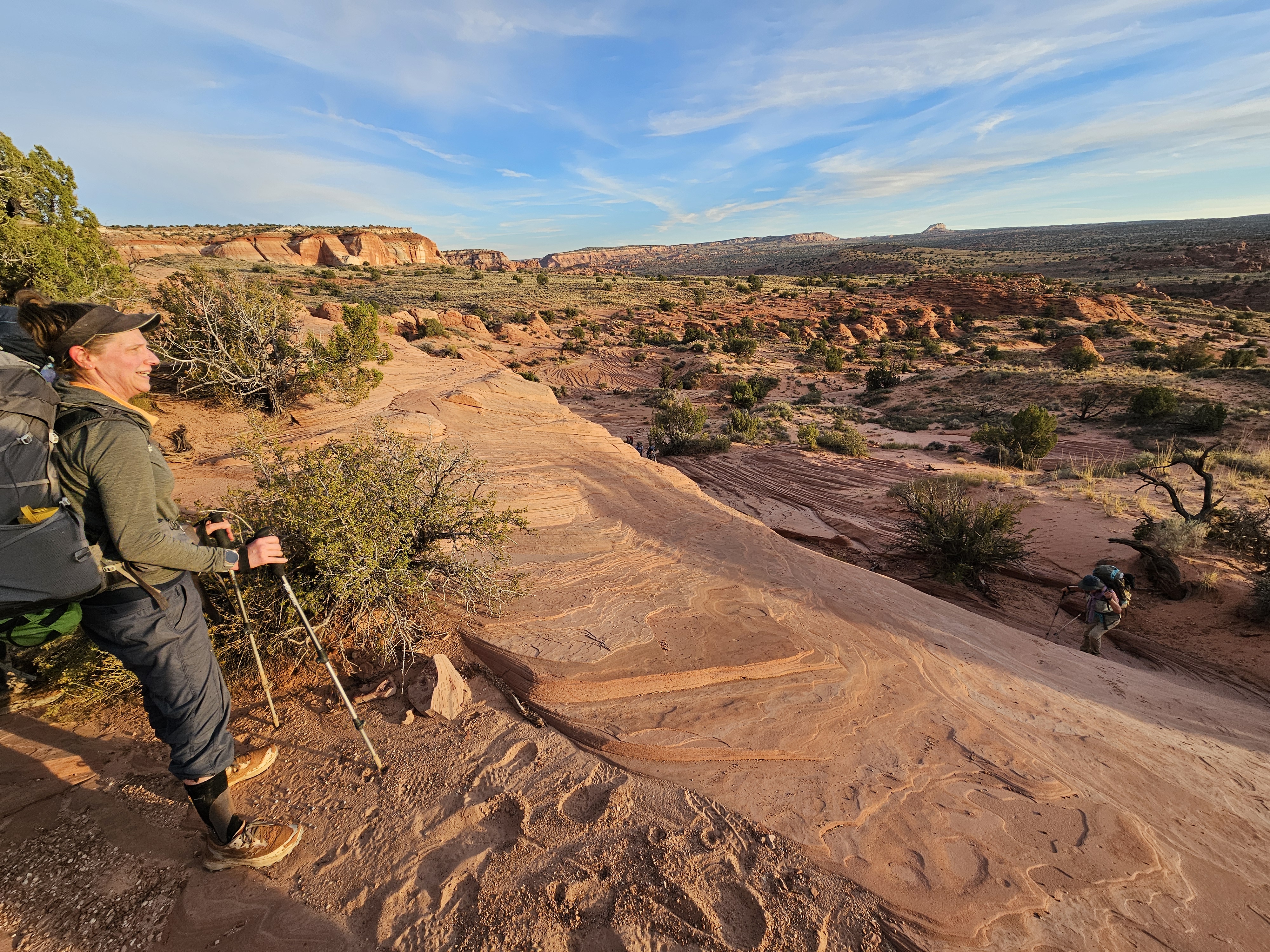 This little wildlife encounter seemed to put a bit of pep into everyone’s step, so it wasn’t that long after that we finally reached the point at which we would exit the canyon. It was called the Middle Route and it was another trail with historic importance, again used by the ancient Puebloans with handholds carved into the rockface that our guides would help talk us through. Because we were later than planned, our driver Wagner (also from Backcountry Found) had left the van and had hiked down into the canyon to meet us. He knows this area like the back of his hand and had successfully completed the Middle Route ascent hundreds of times. This was good to know because, standing at the bottom and looking up, it looked quite daunting!! Having an experienced guide for this part was absolutely essential, as you would likely completely miss the ascent route if you didn’t know what you were looking for. Even when you did, it took a very trained eye to pick out the handholds and know which way to go. The way we did it was in sections – Wagner would demonstrate the first bit, then we would follow in turn. We had the option to remove our backpacks and have those hauled separately up the cliff, but we all decided to keep ours on – by this stage, they weren’t all that heavy – plus who doesn’t love the extra challenge, right?? The first part was the hardest – but it wasn’t any harder than the Boulder Jam we’d cleared earlier on in the day. After the first part, the next few sections were easier, less steep, and so, bit by bit, we wound our way up the cliff face, up and up until we finally made it to the top!! It was a real sense of accomplishment – especially when looking down, to see how far we’d come.