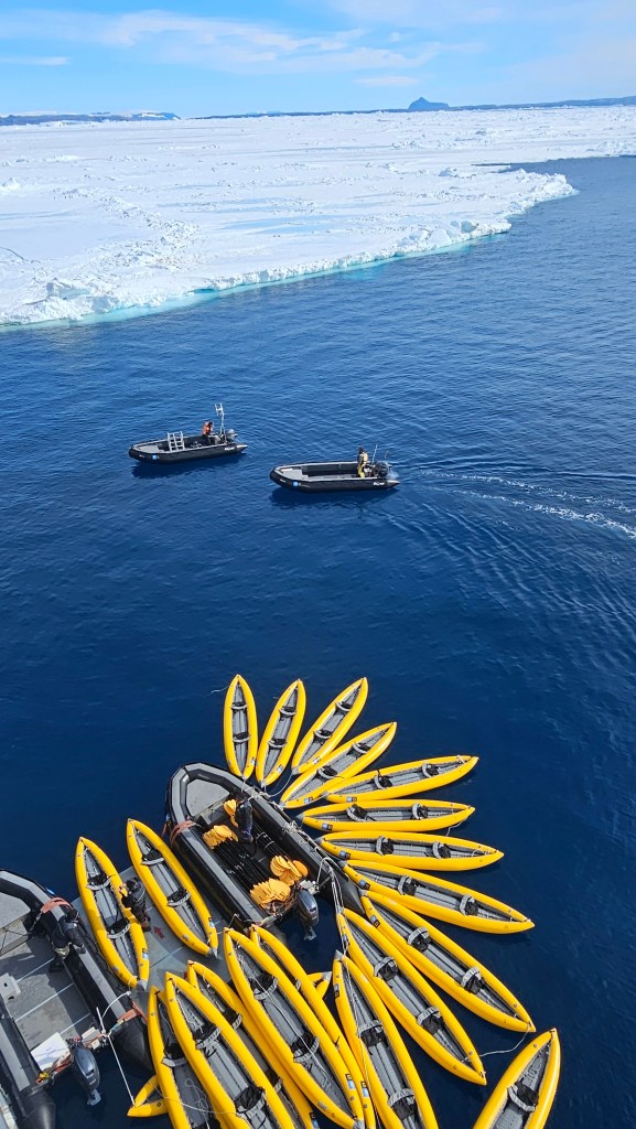 So much fun. The kayaks were super easy to maneuver and steer, although ManpanionTM said something was wrong with his paddle as it didn’t seem to work properly, so he was forced to sit in the back and relax, while yours truly did all the paddling! Hmm…. We spent about 45mins out on the water, just pootling around, tracing along the edge of the sea ice before curving back round towards the ship. The thing which left the biggest impression on me was just how deeply blue the sea was – it was just mesmerizing. Apparently it is possible to get sunburnt in Antarctica so we’d remembered to apply sunscreen to our faces – and went easy on the layers as we’d generate heat as we paddled (at least, I did…).