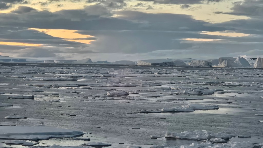 I didn’t expect to sleep well, but after slipping on the eye shades and snuggling up with ManpanionTM and my water bottle, the next thing I knew was Patrik knocking on the door at 6.30am, waking us up with a cup of coffee and some breakfast pastries. We sipped our coffee and looked out at the giant icebergs in front of us, reflecting on what had been an amazing set of experiences. Then it was time to leave our little bubble and head back into our cabin. We skipped the zodiac cruise around the giant tabular icebergs this morning, preferring instead to view the spectacular scenery from the comfort and warmth of our own cabin! As it turned out, that was the only off-ship expedition today as the weather finally began to turn. In his morning’s address over the PA, Jamie had said that we expected to encounter heavy seas starting around 2pm this afternoon. The winds were picking up and the waves were likely to be between 3-5 m in height (around 16ft). Earlier that morning, as we were leaving the Weddell sea and the huge icebergs, we were on the bridge and saw just how easily the ship was able to push its way through the sea icefield. Up until this point, the sailing has been so smooth, its sometimes been hard to tell if you are actually moving or not (assuming you are not looking out of the window) because you can’t hear the engine noise at all. Everything about this ship is state-of-the-art (some say unsinkable – jk) with how the bow is designed in that striking X-bow shape as well as the gizmos that balance the ship (sorry – I can’t remember what they are called but for all you ship nerds out there, here’s a link to our ship https://www.nationalgeographic.com/expeditions/ships/national-geographic-endurance/). Well, all those systems got put to the test this afternoon as it has been pretty rough and the ship has been bouncing around quite a bit. There were quite a few green-looking folk staggering around the corridors and I can imagine that the onboard doctor had a steady stream of visitors for seasickness meds! It was still quite bumpy by dinnertime, but we choose a table right next to the window so we could look out at the huge waves crashing along the side of the ship – it was stunning to watch and utterly compelling. I took a few photos but – like the massive tabular icebergs – nothing really captures the essence and power of what you are looking at. After dinner, we watched this compelling documentary called Chasing Ice which describes the start of the Extreme Ice Project, a photographer’s mission to capture the retreat of various glaciers around the world by using timelapse photography. The composite videos that were shown as a result of these efforts are sobering indeed. We will hear more about the impact of climate change later on in our trip.