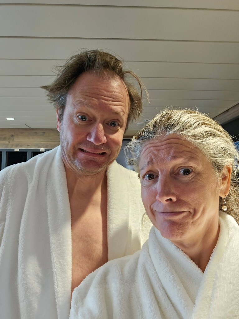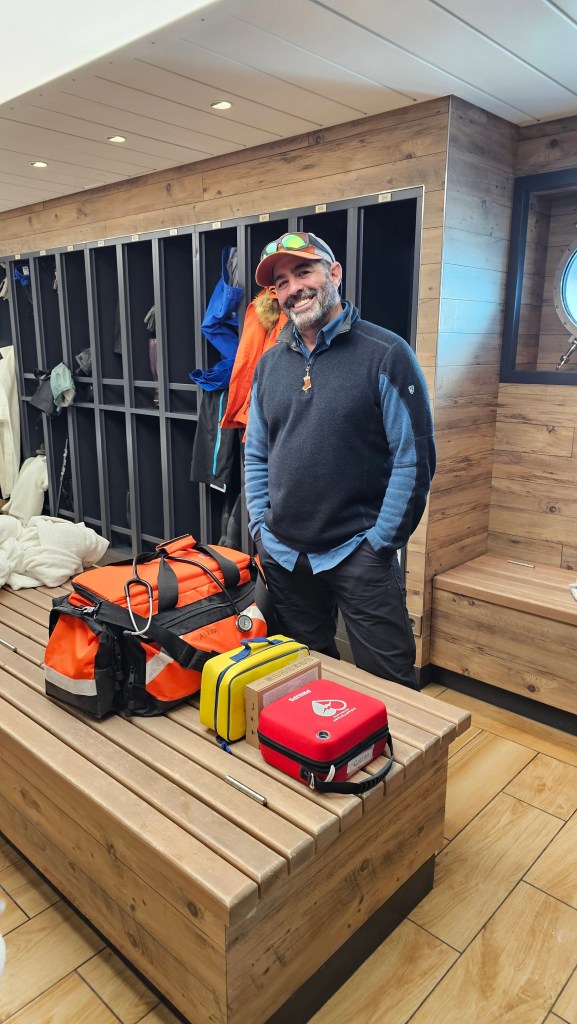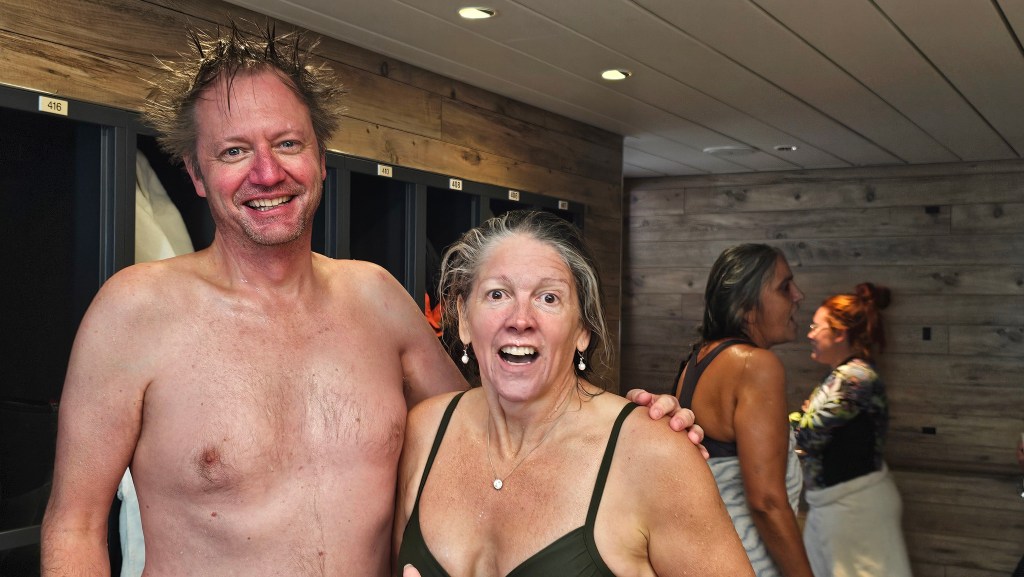 And, just like that, it was all over! We were handed a towel as we got off the zodiac back into the boat and quickly wrapped ourselves back into our warm dry bathrobes! We then collected our paper cup of hot chocolate with a shot of vanilla vodka as well as our Polar Plunge patch, ready to sew onto our expedition parkas for total bragging rights. And the weirdest thing happened. After 2-3 mins, we no longer felt cold at all – we felt euphoric. Part relief at having done it (and not needing the services of the doctors standing by), but mostly fueled by the insane amounts of adrenaline that were coursing through our bodies and making us feel incredible! Our guide from BA, Ana, had been espousing all the benefits of Wimhoff cold therapy and – now feeling the way we did – we could totally understand why. After all the guests had completed their plunge, some of the staff also did it too – by this point, we’d gone up to the top deck, so we could look down and watch everyone. After everyone had plunged, we had a quick warm-up in the sauna before it was then time to meet Patrik (the head of guest services) who was going to take us for yet another adventure!