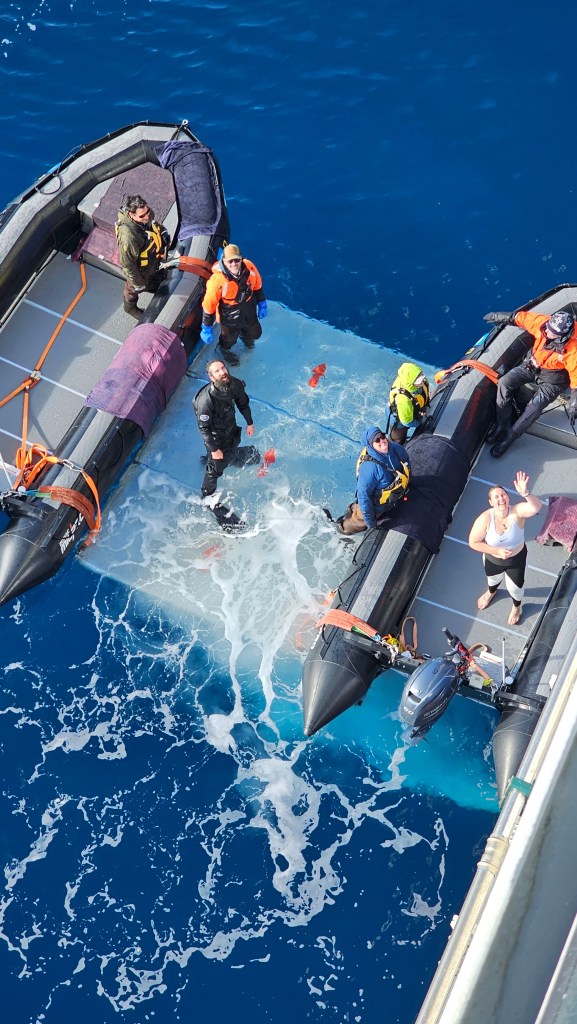 We stayed out on the sea ice for about an hour, watching the penguins, before it was time to head inside. As we disembarked, I noticed a table was set up with some cups and a big vat of hot chocolate – and that’s when we heard those immortal words “Polar Plunge”!!! Yep – as the conditions were as perfect as you could get, our expedition team decided this would be the perfect time to take the plunge! If you had asked me before this trip if I was going to do it, I would have replied emphatically “Hell, No!” but instead I found myself saying, “Fuck it, lets do it!” So, there we found ourselves, back down in the Gear Dock signing waivers that we didn’t read (had to sign 3 times) along with 59 of our fellow crazy passengers! We didn’t expect to have to queue to do the plunge! It was a really fun atmosphere as we waited – especially as the first brave souls started to come back through the dock, exhilarated by their experience! And it wasn’t just the younger folk who were taking the plunge – all ages, shapes and sizes were up for it! We waited for about 10 mins, shuffling forward until we were almost at the dock door and couldn’t wait any longer to take off our nice warm fluffy bathrobes. When it was our turn, we were helped into a zodiac, then walked across a short, shallow platform into another zodiac where we would actually jump into the Weddell Sea! Already, wading into the water and standing outside in just a bathing suit, it was cold – but it felt silly to complain about feeling cold when you were about to go full on into the water! ManpanionTM and I had decided to take the plunge together and so we had to decide who would stand on which side – the outer person having further to swim back to the platform. Made sense to me that it should be the person with the longest legs, so I voluntold ManpanionTM it would be him. And then, on the count of three, we jumped.