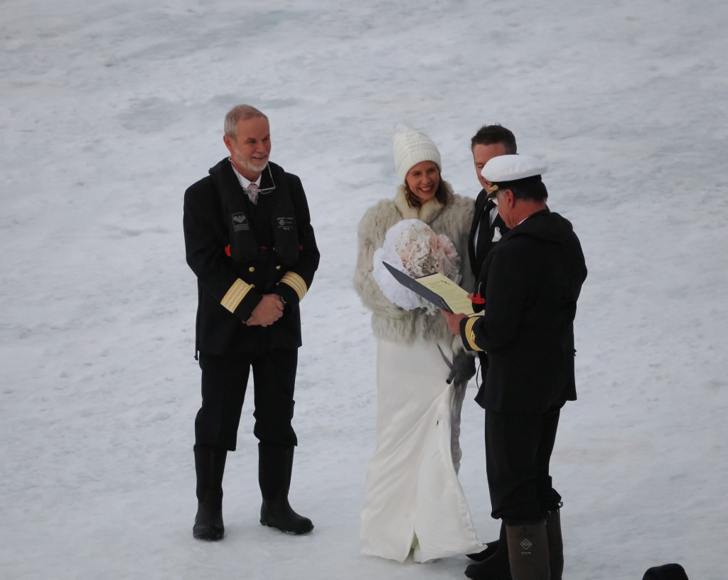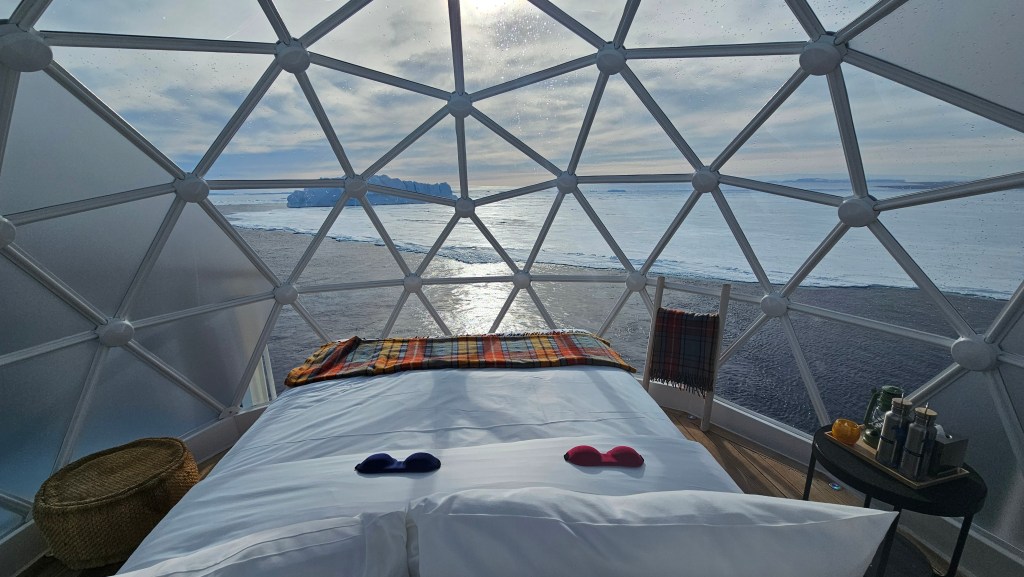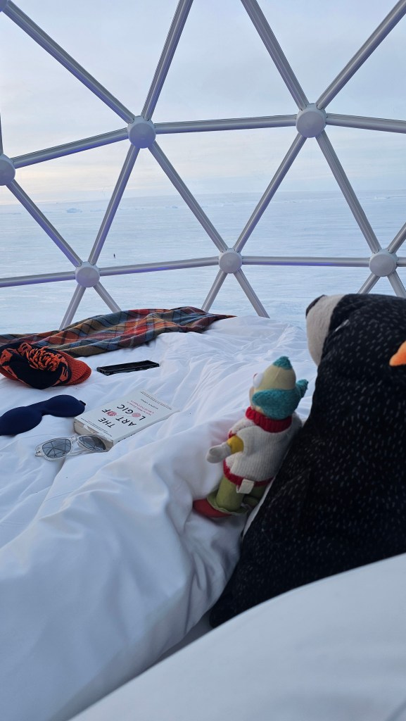 Because we had reserved a fancy pants Category 7 cabin (which I know I still owe you a tour of), a big part of its benefit was that you would get priority on booking a night in the igloo. There are only 2 on board, at the bow of the ship and we are at sea for a total of 8 nights, so that’s only 16 possible booking opportunities – basically, not everyone who wants to spend the night in the igloo is going to get the chance to do so. We’d only upgraded from our original Cat 5 cabin a few weeks before the trip and the igloo reservation was one of the main reasons we splurged the extra cash. Given not all the Cat 7 cabins had been booked out, we were pretty much guaranteed to get our night under the triangulated truncated icosahedron. And this morning, when we left the cabin to go to breakfast, there it was – the letter of invitation to the Igloo Experience left in the little pigeon hole outside our door! We would have access to the igloo from after dinner until breakfast the next morning. Dinner was again excellent (so much food!!!) – you can actually get half portions so you can try more dishes – so that’s what I did and enjoyed both tiny lamb ribs as well as seabass (which is actually Patagonian toothfish!). After dinner, we headed straight to the igloo to make the most of our time there. It was pretty toasty warm – but Patrik recommended dressing in layers and a hat, socks and gloves as it would get colder during the night. Eye shades had also been provided as it stayed quite light for most of the night and there were also two big fat hot water bottles stuffed inside the bed, so we were very comfortable! As we were getting comfortable in the igloo, there was another after-dinner excursion with the opportunity to take another walk on the sea ice and hang out with the Emperor and Adelie penguins again. We decided to remain in our perch, looking down on all the activity below – which included not one, but two, weddings!!! And yes, both brides did wear white dresses – I could see one of them turning visibly redder from the cold the longer they were out there!! Sunset was also gorgeous – but alas we didn’t see any stars – partly cos it was too cloudy but also because it didn’t get dark until well into the night and we were already asleep.