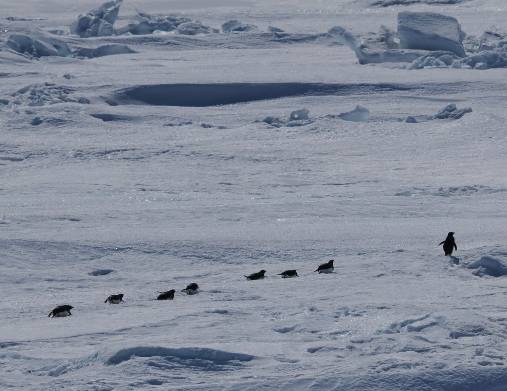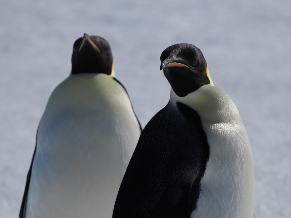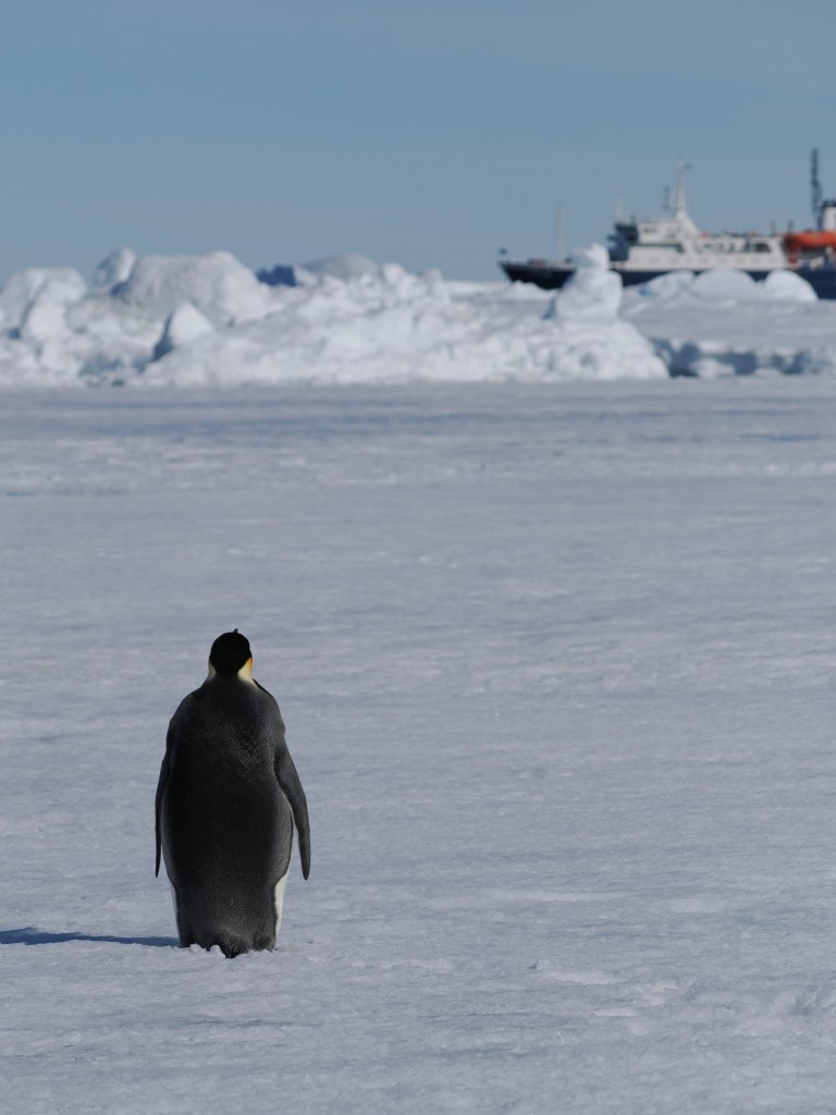 After our paddle, it was time for lunch and it was a British theme, with both fish and chips and bangers and mash, followed by Eton Mess, on the menu! (the head chef is a Swedish lady called Sarah – and the food has been consistently outstanding!). After lunch, I stood out on the deck for a bit watching the expedition scouting team check out the landing site for this afternoon’s activity (a walk on the sea ice) – and saw a big pod of Adelie penguins leaping and gliding through the water! I did get some video (this fancy Olympus camera that I’ve borrowed also shoots video) – but forgive any shakiness – I’m not going to be rivaling David Attenborough anytime soon! We were split into 2 groups – again, by Zodiac boats – and we were going to be in the second group at 3.30pm. In the meantime, we listened to a lecture on penguins – the start of which was, fittingly, disrupted by the sighting of a lone Emperor penguin, out on the ice near where the afternoon’s expedition would be! We were very envious of the first group that headed out – and just crossed our fingers that the penguin would still be there when it was our turn. It was – and it got even better as the first Emperor was joined by a friend!! There were also a ton of Adelie penguins (the ones with the googly-looking eyes) around so it was a wildlife-filled walk!! The Emperor penguins are so majestic and enigmatic – they just look as they are filled with profound thoughts, as they stand there gazing off into the distance. And then they start to move. Then they don’t look quite as stately, as they waddle across the ice, before dropping to their bellies and pushing themselves along with their feet. The description I’ve heard multiple times on this trip already at that penguins are “nature’s toddlers” – very fitting! As impressive as it is to watch the Adelie penguins as they shoot out from the water and propel themselves up onto the ice, as soon as they hit land, they have a tendency to tumble over or land with a big fat squelch! The ice (which is only 2 metres thick) was pretty slippy, so I was glad I’d taken a walking stick out with me – otherwise I’d have been on my ass, like the penguins!