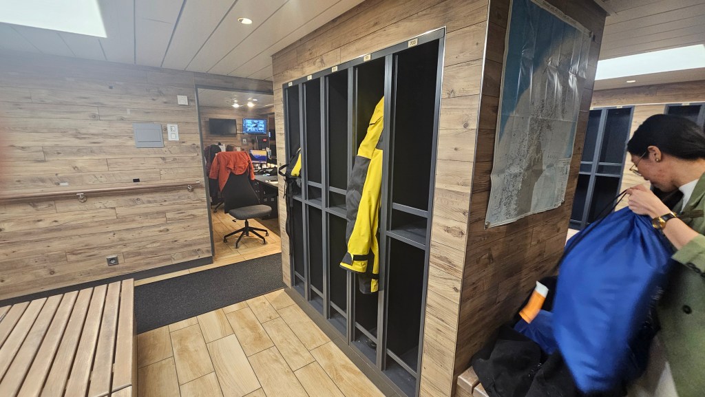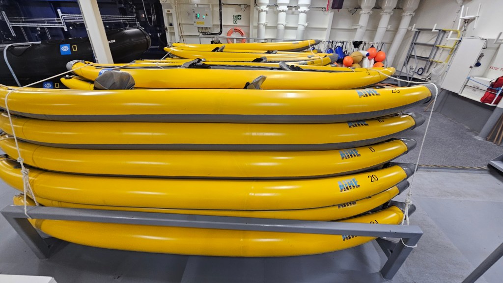 The other fun activity today was that the ship’s crew (once more ably managed by Patrik) opened up some of the private areas ship for us to have a look round and go behind-the-scenes. I’d asked earlier in the week if I might be able to have a look round the kitchen, but sadly it was not included on the tour – but we did get to check out the laundry room (which we’ve been availing ourselves of every day!), the engine room, the controls room and the “garage” where they store all the zodiacs and kayaks. This area is directly below our cabin and we got used to hearing the loud metallic “CLAANNGGG” when they would open the hatch door, first thing in the morning for an operation, so it was really interesting to get in there and have a poke round. As you might expect, everything was spotless and organized perfectly – not one paddle out of place! And – yes – in a surprise to no-one, there were also some edible treats laid out for us in the laundry – lots of delightful little pastries (the pastry chef Sage is an evil genius) as well as some savory hor d’ouevres. I don’t think I have been hungry for one single minute since I stepped onto the boat. My pants are significantly tighter (maybe the laundry shrunk them?) and belly rounder than it was 10 days ago – but worth it!! Every single mouthful has been delicious and I will happily hop back into my regular routine of eating mostly vegetables when I get home so I’m not stressing about it too much!! I do now finally understand it when folk who go on cruises say they come back 1-2 dress sizes larger – its very easy to see how that can happen, even when you are going to the gym or choosing the “lighter” options for lunch. I think you would probably just have to skip meals in order not to gain any weight at all – and that just wasn’t gonna happen on this trip!!
