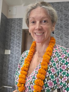Anyway, visa in hand, it was another queue to then get through the immigration checkpoint, and then yet ANOTHER line to go through another bag screening (which seemed a bit redundant – we’d all just gotten off a plane and hadn’t been anywhere else, so…??). After that line, we finally got to the baggage hall to retrieve our luggage – which all turned up! Yey!! And then there was one last line after we’d collected our bags for another security check (they really don’t want you bringing those bricks of money or gold bullion into the country, so i’m glad I left mine at home). All in all, that whole process took a solid hour and a half – at least half of it spent in queues of indeterminate utility. Anyhoo, all the waiting around did give me the chance to meet and get to know one of my new travel buddies, Racheal, a bit, so that was nice. There are only 8 of us now on this trip (a couple people canceled at the last moment) which I think is the perfect size of group. Also on our flight was Forest, a friend of both Racheal and Amanda’s – but she was in economy enjoying the high-definition stereo sound of twin babies crying through the flight, so it took her a while to get through all the arrival shenanigans. But we found our arrival team easily and were greeted with a warm smile and a wonderfully fragrant garland of bright orange marigolds – very grateful for it masking the day-old travel funk!