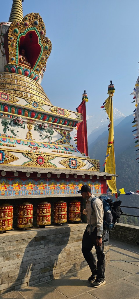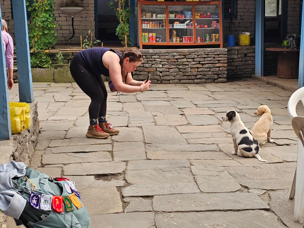 Not gonna lie. Today was tough. My cold has well and truly kicked in and is kicking. my. ass. I also had a pretty crappy night’s sleep because of dogs barking and cockerels crowing at 3am woke me up and I then struggled to get back to sleep. On the bright side, it did mean I was up well in time to enjoy the incredible sunrise over Machapuchre (the local name for the Fishtail Mountain) and Annapurna South. I always thought that photographers sounded a bit up their own arse when they’d talk about the Quality of the Light and How It Can Shift From Minute to Minute – but its actually true! It was amazing to see how the shadows evolved in depth and color and how the top of Annapurna South burned brilliant gold.