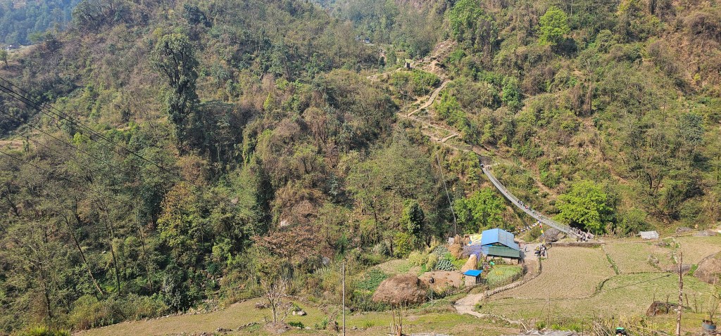 Learning for today – Liquid IV hydration powders do not mix well. Do not through a sachet of lemon and lime into your peach remnants and then expect it to taste good. As a further lesson, do not then use said hydration liquid to wet your toothbrush and toothpaste. It is not an acceptable flavor sensation. and lemon lime do not mix. After lunch, we continued our way through the forest, ascending and descending, and crossed several rivers on a number of bridges of various rustic designs. One exciting moment – we saw an alpha male Himalayan langur in the forest, just off to our left. We couldn’t see him super well, but it is considered a holy animal, so we took that as a sign of good luck and that maybe, just maybe, our final destination of Dovan was within reach.