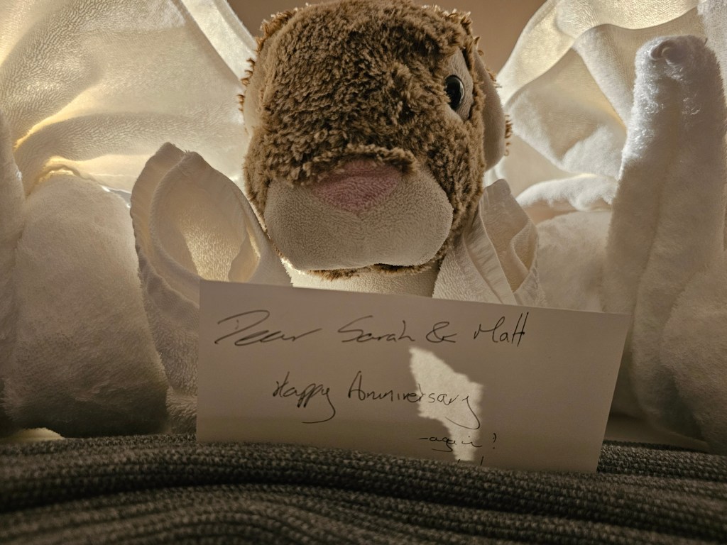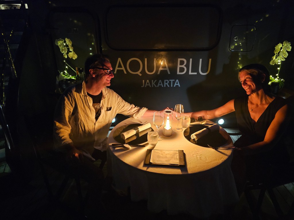 After the last snorkeling excursion, there was another episode of “Ring of Fire – An Indonesian Odyssey” offered downstairs in the Salon. I gave it a miss and instead caught up on my blog and just chilled out on the deck. Dinner brought a wonderful surprise – Dean and the crew had set-up a private dining area for ManpanionTM and I down on the swim deck (the area where we get on the tenders) and so we got to enjoy a SUPER romantic dinner, just the two of us, under the stars. It was lovely – the lights on the back of the boat occasionally illuminating some fish swimming by, with our Spotify playlist of mushy duets connected to the Bose speaker that had been set up to provide some background music (we made sure not to connect to the whole boat by accident!). It was a really thoughtful gesture – I’m not sure quite how much ManpanionTM was involved in setting it up vs Dean – but it felt really special, so thank you Dean and crew. What a unique experience with which to celebrate 10 years of togetherness.