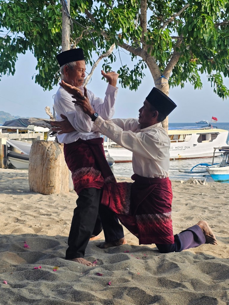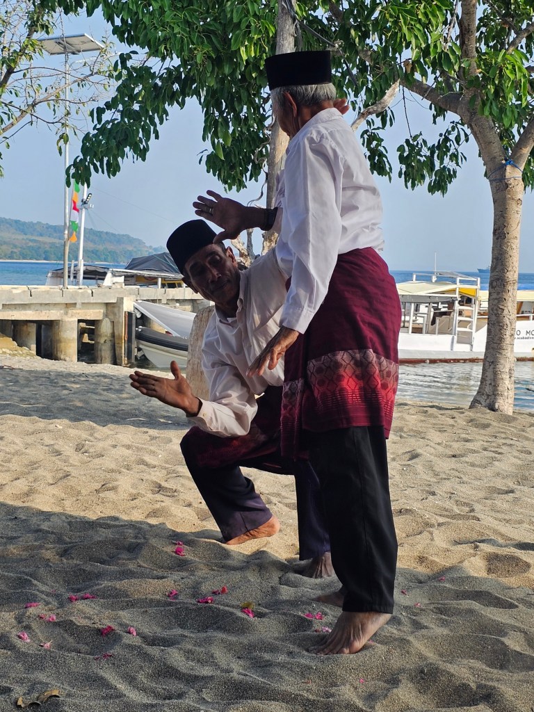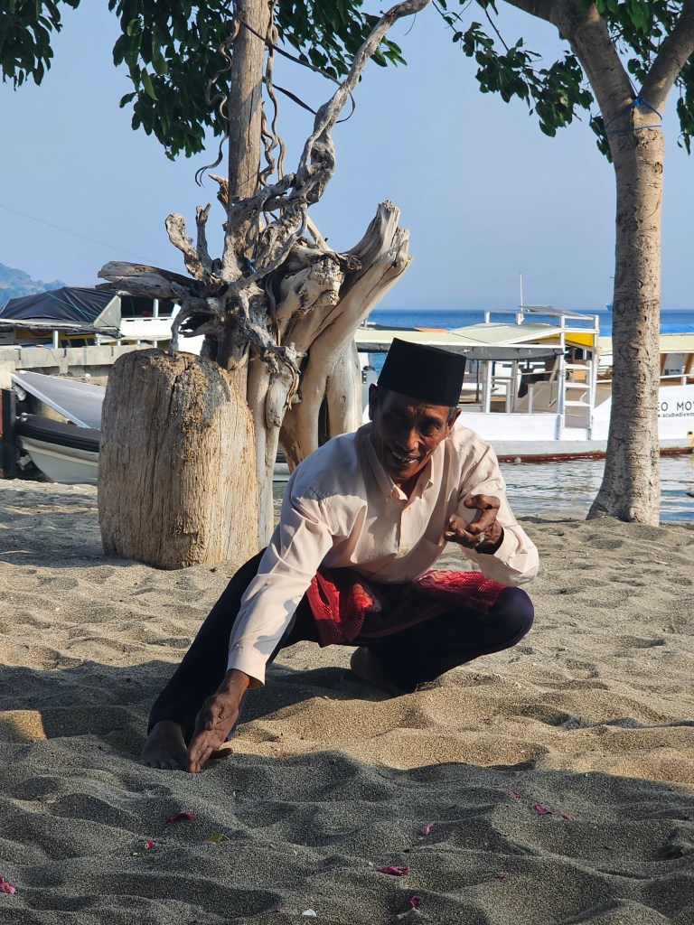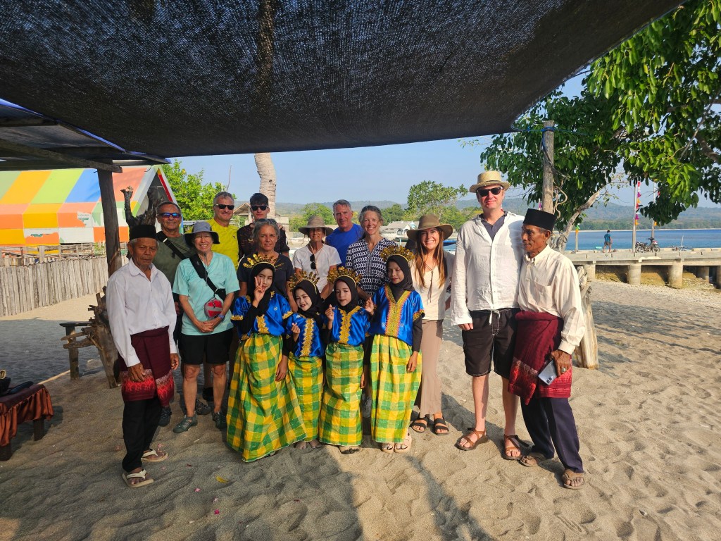 After lunch, we took our first excursion to Moyo Island https://en.wikipedia.org/wiki/Moyo_Island, so all piled into one of the two tenders. After a short 15 min ride, we arrived at the jetty and were escorted to a covered area where the locals had prepared to welcome us. As most of Indonesia is Muslim (Bali is more of an exception, being mainly Hindu and Buddhist), we had been asked to dress appropriately to respect their cultural sensitivities (no bare shoulders or cleavage or short shorts). We were treated to some fresh coconut water (served straight from the nut!) and then two dances – one featuring 4 young girls (9yrs and up) throwing flower petals and making delicate hand movements (and securing audience participation – ahem) and the second, a form of martial art with 2 elderly chaps engaged in a beautifully graceful, stylized dance of combat. It was mesmerizing to watch. There are about 2,000 permanent inhabitants on the island and the economy here is mainly based on cashew farming. There are no hospitals or doctors on the island (just a clinic and a nurse) so if you need specialist medical care, you have a 2-3hr boat ride to one of the larger islands, followed by a 2hr jeep ride. Tourism is becoming a larger source of revenue for the island – Aqua Blu is obviously contributing to this in a meaningful way, and recently the coastline surrounding Moyo was designated a marine conservation area, so its encouraging they are looking to increase tourism while preserving the natural beauty and wildlife.