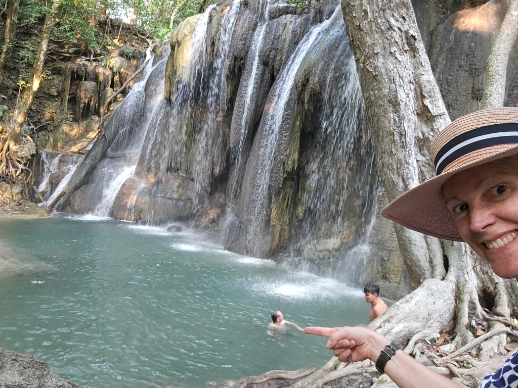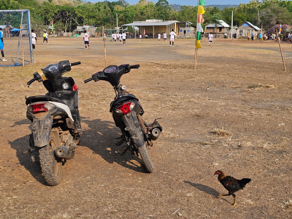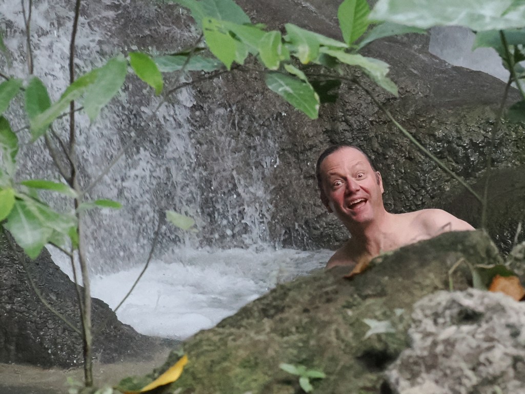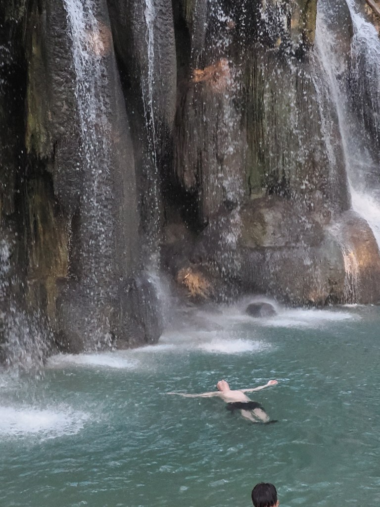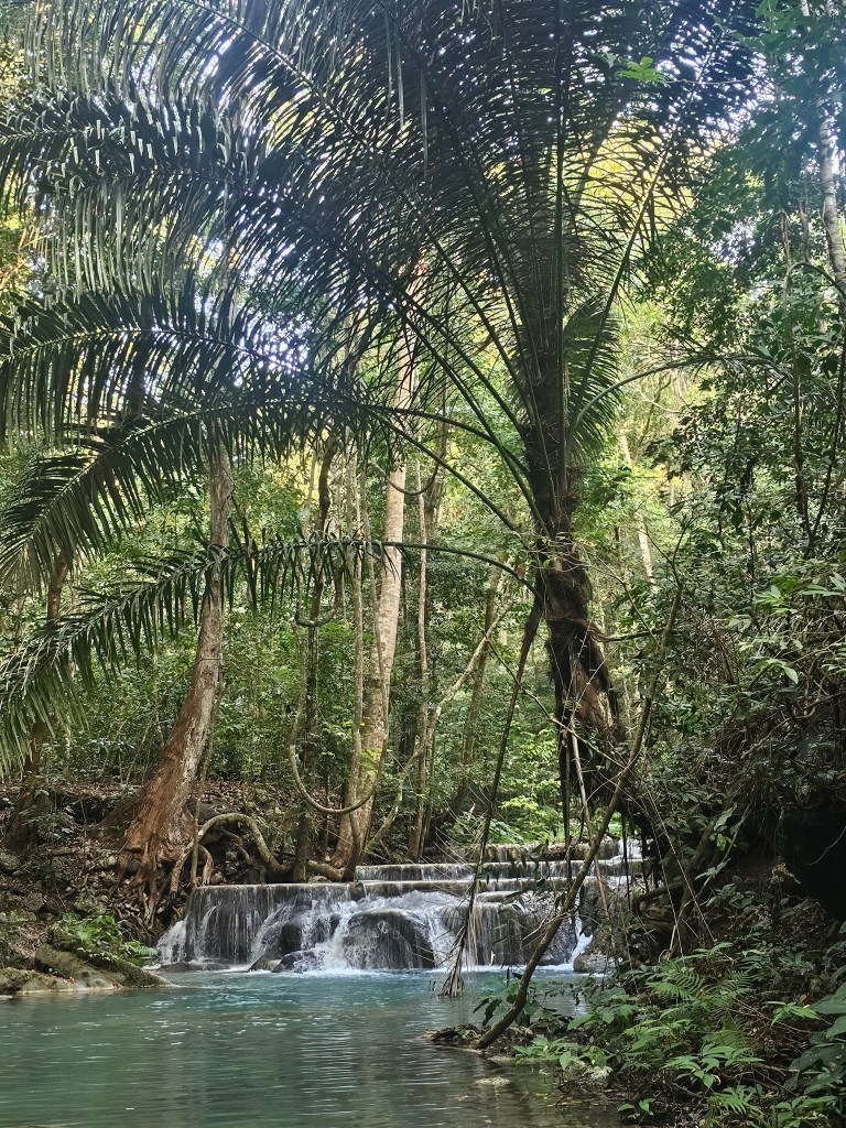 After the welcome festivities, we took a short walk through the village, stopping by the local soccer pitch where a tournament was in full swing, to get on our Aqua Buggy for a bouncy 20 min drive through the forest to the waterfall. En route through the forest, we caught sight of one lone monkey, just sitting on the ground, looking for all the world like he was waiting for a bus! We heard several squawky birds – but no idea what they were as Merlin (my birding app) was stumped. After the ride, it was only a short walk to get to the waterfalls – and they were very lovely, as promised. While the falls themselves were nice (unfortunately Iguazu Falls in Brazil has kinda ruined waterfalls for us now), it was the series of cascading pools leading away from the falls that were more memorable, set against the lush backdrop of the forest. It was quite lovely. ManpanionTM went in and had a splash around, but I was content simply to stay on the river bank and take photos.