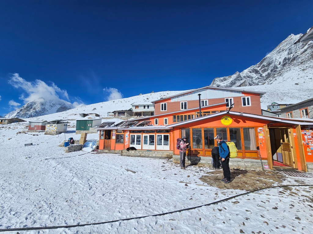 Today was fucking brutal. This is not going to be a long blog post because I am absolutely FREEZING – even though I am parked next to the stove at our tea house in Gorak Shep. There was a slight change to the itinerary outlined above – we still hiked to Gorak Shep from Lobuche in the morning, arriving by lunchtime. It had snowed again overnight so the skies were a clear blue – but it was very cold. Let’s not forget, people, that we will be sleeping in tents at Base Camp tomorrow night! We must be completely mad. The village of Gorak Shep is very small with only about 7 tea houses. While my room is fine (although there are some suspicious looking stains on the bed sheet) there is not a lick of heat anywhere to be found. Its about 10 degrees outside right now – and it actually feels colder in my room. As I write, its now 7pm, and it is definitely below freezing inside.
