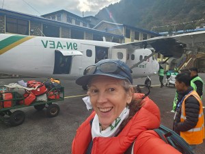 I survived my first day trekking to Everest Base Camp!! I posted our official itinerary above and will do for each post that so you can see the plans for the day. The “early morning start” was, indeed, early AF as we were to meet in the lobby at 4.30am, ready for a 4.45am departure to the airport. I knew my FlyKit wasn’t going to be happy with me (sorry) as I attempted to go to bed at 8pm rather than the proscribed 9.45pm. Alas, I ended up having a shitty night’s sleep – not because of jetlag, but mainly because of Excessive Door Slamming from my inconsiderate hotel neighbors. Grrr. I finally gave in at around 3am and got up and futzed around finishing my packing, taking care to stay within my luggage weight allowance of 10kg for the holdall and 5kg for my backpack. I mainly achieved this by stuffing as much as I could get away with into my puffy coat’s pockets (my phone, 2 battery banks, Garmin sat nav, wallet, hat, macrame kit, fiber chews – you know, the essentials). I did feel a little sheepish when I had to empty all my pockets before going through the security scanner, but I’m sure these people have pretty much seen it all.