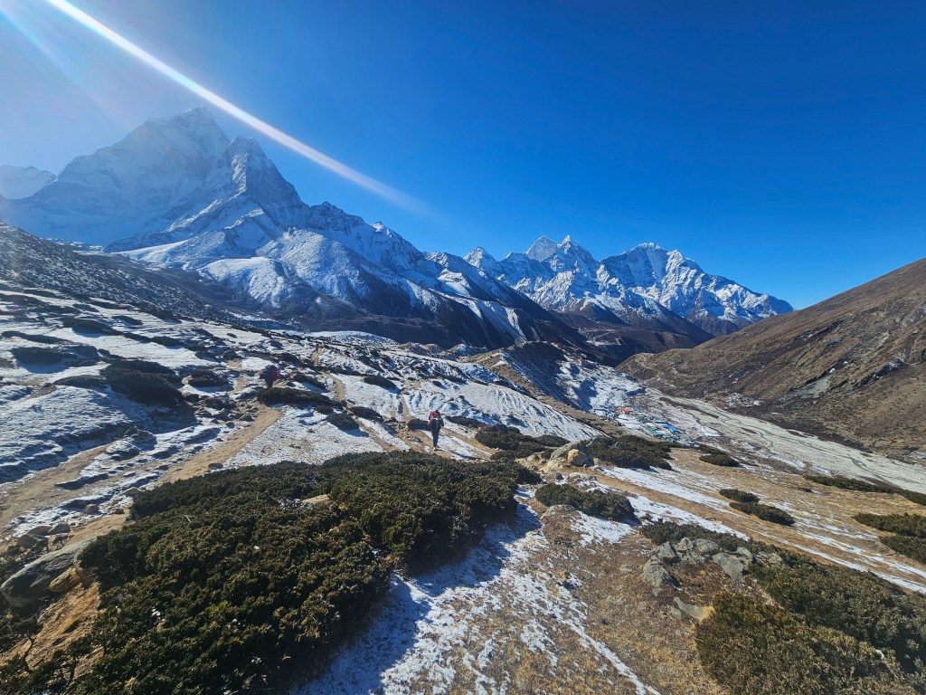 Time to continue our onwards progress towards EBC. Had another GREAT night’s sleep so woke up again at 5.30am feeling refreshed and ready for the day. Breakfast today was some Tibetan bread with jam and butter – pretty much a fried doughnut which was jolly tasty! It was a clear day, with bright blue skies – but it was COLD, my weather app showing a temperature of only 16 degrees. Even inside, in the dining room, I could see my breath. It hadn’t snowed again overnight, though, which was good in one respect (no spikes needed) but it did mean that the trail had become very mushy and slippy in places.