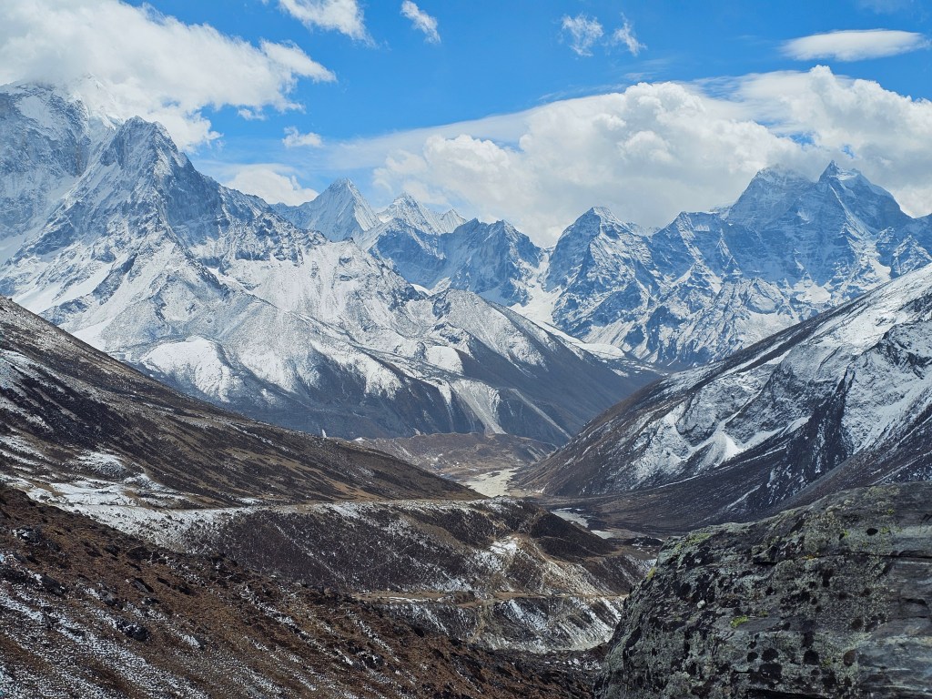 So I have to say – the first bit of hiking this morning, from Dingboche to our lunch spot at Thukla, was pretty easy. The terrain was really nice (except for a few muddy bits) so it made for a low-stress, easy stroll! (albeit one at 16,000 ft!!). We passed a few stone outbuildings that are used by the local farmers – the walls surrounding them made for a very scenic pee stop! (there are some VERY well fertilized fields out there). We made great time so reached our lunch stop by 10.30am! We had to cross the river via a small bridge (there’s a large suspension bridge that is still under construction) which also took us past an area with a high rockslide danger. DJ went ahead to check it was safe first – then motioned for us to quickly follow. It reminded me of the section on the Annapurna Base Camp trail where we had to traverse a snowfield that had high avalanche potential.