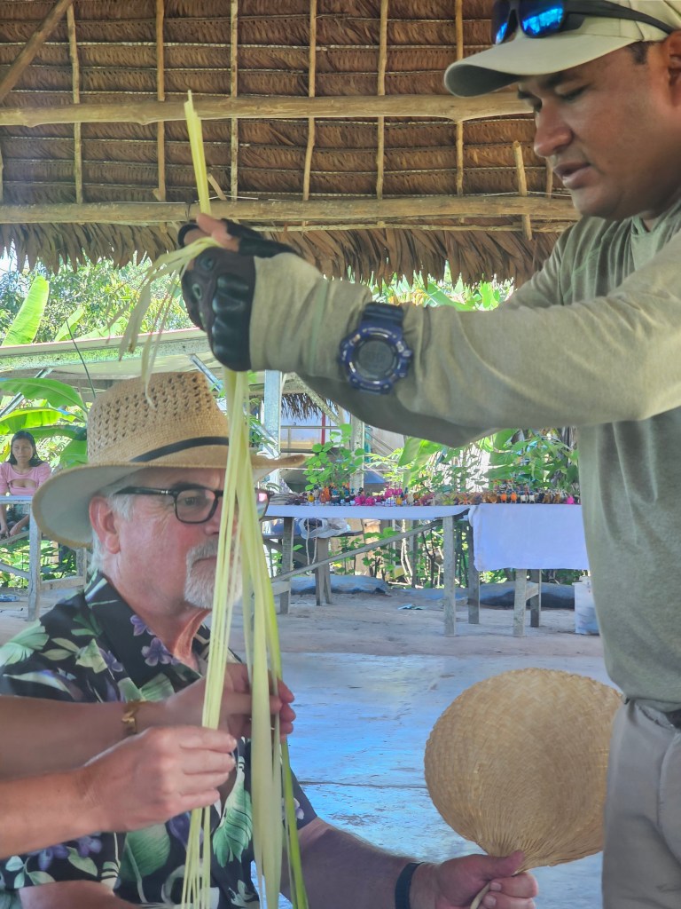 Anyway, today was fairly relaxed (no 5am wake up calls!) with breakfast at 7.30am followed by the first outing of the day at 9.30am, a visit to the village of Amazonas where we would be shown local weaving crafts (and “optional” (ha!) shopping. It was about a 20 min chug on the skiff (only 1 needed to fit us all in) to the town and we had a short walk to the center of the village where a local lady (through translation from Vladimir) explained the process behind turning palm leaves into all sorts of brightly colored woven goods. The village has 3 main sources of revenue/commercial activity – fishing, agriculture and weaving – with the women of the village focusing on the latter. In addition to the process of isolating and drying the palm fibers to be made into twine and thread for weaving, she also showed us the local plants and herbs that were used for dying the strands. I can’t remember them all – but there was turmeric and achiote to produce vibrant orange and reds.